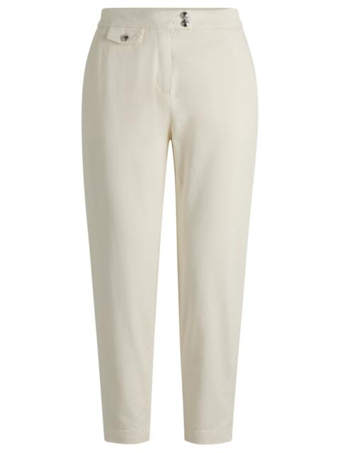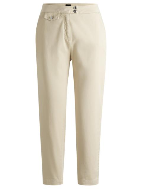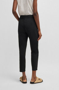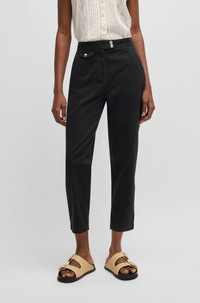 SIZE AND FIT The model wears a size 4 and is 5'11" tall with a, 31" chest, 23" waist and 34" hips. DETAILS C_Taschina-D - 50534938 Casual chinos with a coin pocket and branded button by BOSS Womenswear. This pair is crafted in brushed satin blended with stretch for comfort. Regular fit Mid rise Button and zip closure Slim leg Pockets bottom front: Side pockets Unlined QUALITY & CARE INSTRUCTIONS Reduced Dry Clean Do Not Bleach Do Not Tumble Dry Quality: 97% Cotton, 3% Elastane, pocketing: 100% Cotton Iron Low Heat Machine Wash Cold Gentle