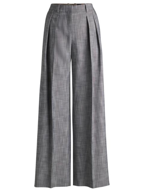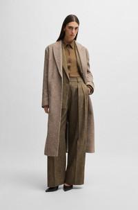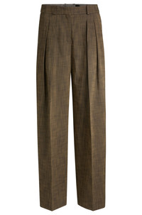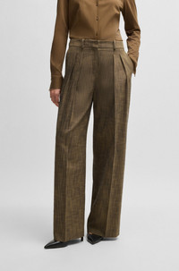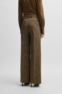 SIZE AND FIT The model wears a size 4 and is 5'9" tall with a, 31" chest, 24" waist and 35" hips. DETAILS Tiana2 - 50530924 Pleat-front trousers by BOSS Womenswear. Crafted in melange tailoring fabric, this regular-rise pair has a straight fit with a wide leg. Regular fit Regular rise Button and zip closure Wide leg Pleat front Pockets bottom front: French pocket Pockets bottom back: Welt pocket with buttons Fit foot width: 61,9 cm (24.4 inches) QUALITY & CARE INSTRUCTIONS Quality: 91% Viscose, 8% Polyester, 1% Elastane, pocketing: 100% Cotton Do Not Tumble Dry Do Not Bleach Do Not Wash Iron Low Heat Reduced Dry Clean