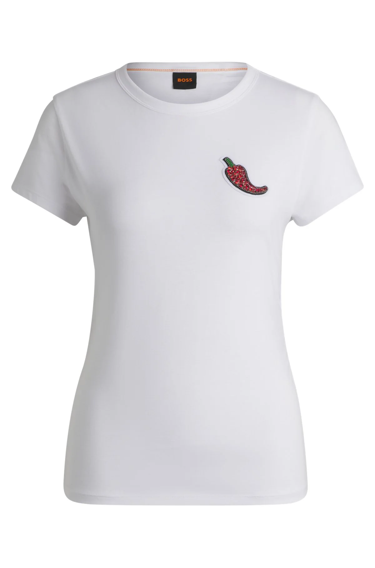 SIZE AND FIT The model wears a size S and is 5'9" tall with a, 31" chest, 24" waist and 35" hips. DETAILS C_Endora - 50535125 A crystal-studded chili pepper brings playful sparkle to this BOSS Womenswear T-shirt. Breathable cotton jersey. Fitted shape. Flattering gathering at the waist. Regular fit Neckline: Scoop neck Short sleeves Standard length QUALITY & CARE INSTRUCTIONS Cold, gentle machine wash; reduced spin speed. Quality: 100% Cotton Do Not Tumble Dry Do Not Bleach Iron Low Heat Do Not Dry Clean