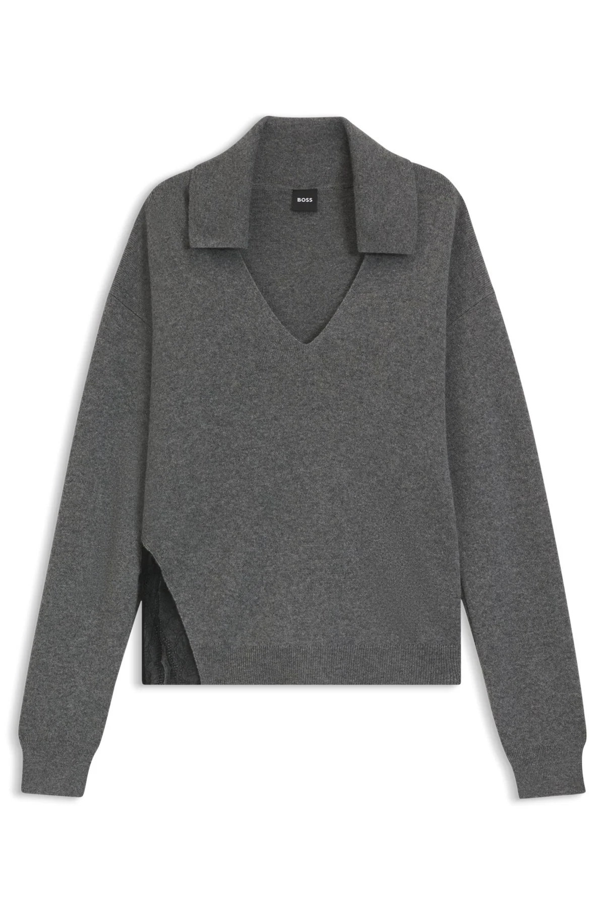 SIZE AND FIT The model wears a size S and is 5'10" tall with a, 31" chest, 23" waist and 35" hips. DETAILS Layer up in luxurious comfort with the wool-cashmere knit of this V-neck BOSS Womenswear sweater. Oversize collar detail. Side slit with feminine lace inserts. Relaxed fit Long sleeves Flanola - 50547882 QUALITY & CARE INSTRUCTIONS Quality: 90% Virgin wool, 10% Cashmere, Facing: 100% Polyamid Hand Wash Only Do Not Tumble Dry Iron Low Heat Do Not Bleach Do Not Dry Clean