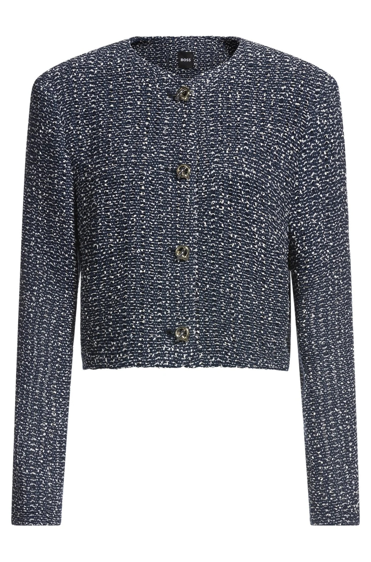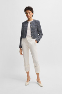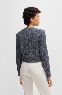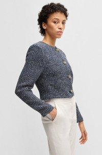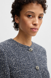 SIZE AND FIT The model wears a size 4 and is 5'10" tall with a, 31" chest, 24" waist and 35" hips. DETAILS Jolena1 - 50537483 With its clean profile, this BOSS Womenswear jacket is a refined choice. The two-tone tweed is made with soft cotton. Gold-tone knot buttons. Fastening top: Button closure Number of buttons: 4 or more buttons Welt chest pockets Partially lined Fit back length: 48 cm (19 inches) QUALITY & CARE INSTRUCTIONS Do Not Wash Quality: 50% Cotton, 38% Polyester, 7% Polyurethane, 5% Other fibres, Lining: 100% Viscose Do Not Tumble Dry Iron Low Heat Do Not Bleach Reduced Dry Clean
