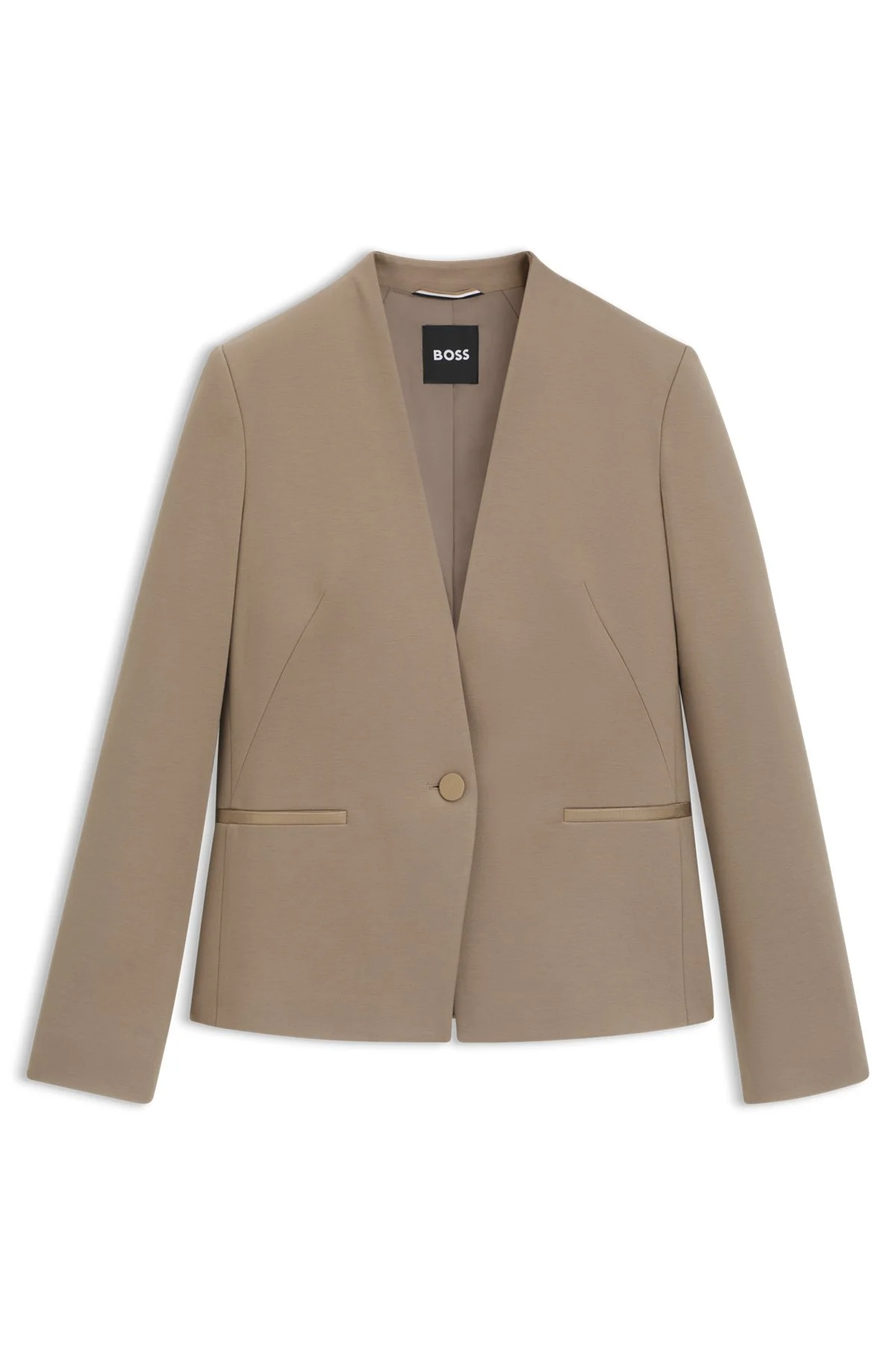 DETAILS Jemma1 - 50541998 This BOSS Womenswear blazer creates a sharp look, with its collarless design and slit cuffs. Regular fit Comfortable stretch Punto Milano fabric. Single hardware button. Regular fit Fastening top: Button closure Number of buttons: 1 Pockets top: Welt pockets Slit cuffs Fully lined Fit back length: 62 cm (24 inches) QUALITY & CARE INSTRUCTIONS Reduced Dry Clean Do Not Wash Iron Low Heat Quality: 65% Viscose, 30% Polyamid, 5% Elastane, Lining: 55% Polyester, 45% Viscose Do Not Tumble Dry Do Not Bleach