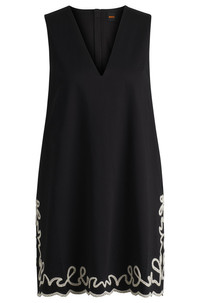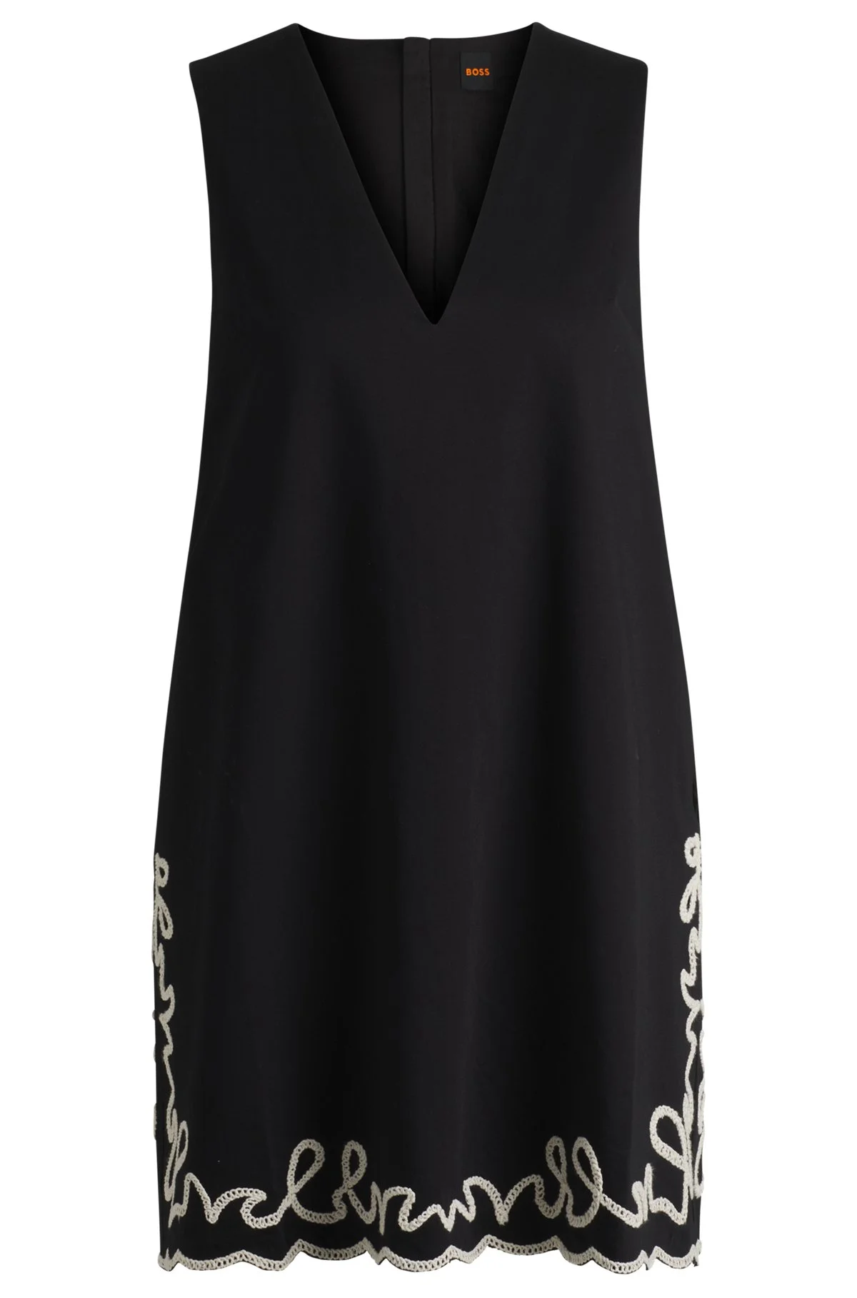 SIZE AND FIT The model wears a size 4 and is 5'10" tall with a, 31" chest, 24" waist and 35" hips. DETAILS C_Dembrolai - 50540370 Cut with a slightly A-line shape, this BOSS Womenswear dress has pretty contrast embroidery for modern interest. V neckline. Weighty cotton twill. Regular fit Fit back length: 90 cm (35 inches) QUALITY & CARE INSTRUCTIONS Quality: 100% Cotton, Lining: 100% Cotton, Embroidery: 100% Cotton Hand Wash Only Do Not Tumble Dry Iron Low Heat Reduced Dry Clean Do Not Bleach