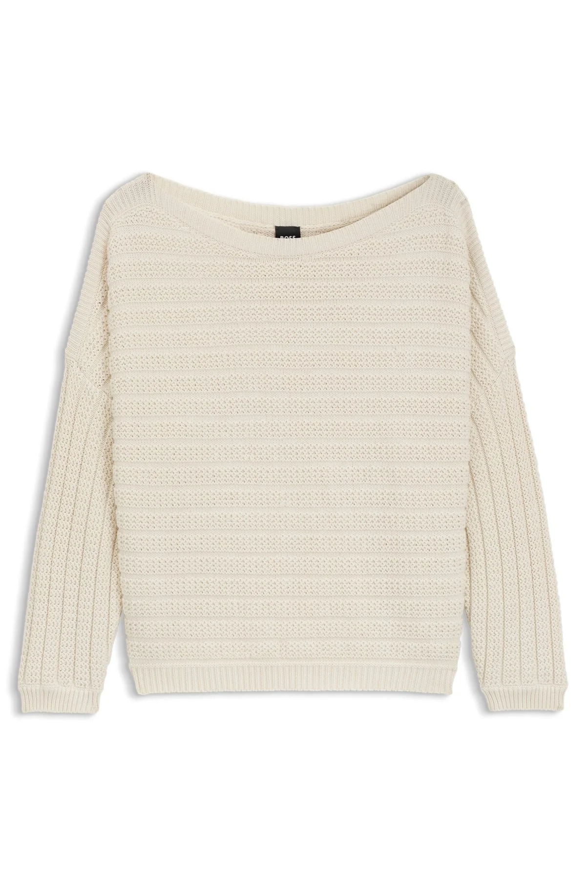 SIZE AND FIT The model wears a size S and is 5'10" tall with a, 31" chest, 24" waist and 35" hips. DETAILS Fleminda - 50543049 With a wide neckline and dropped shoulders, this BOSS Womenswear sweater provides an effortless layer. Knitted in cotton-rich yarns. Mixed structures. QUALITY & CARE INSTRUCTIONS Iron Low Heat Hand Wash Only Reduced Dry Clean Do Not Bleach Do Not Tumble Dry Quality: 91% Cotton, 9% Polyester