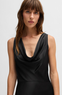 SIZE AND FIT The model wears a size 4 and is 5'8" tall with a, 33" chest, 25" waist and 35" hips. DETAILS Dawida - 50528773 A modern dress with sleeveless styling by BOSS. This feminine piece is crafted in fluent satin with a draped cowl neckline. Regular fit Neckline: Wide neck Fastening top: Side zip closure No cuffs Unlined Fit back length: 105 cm (41 inches) QUALITY & CARE INSTRUCTIONS Quality: 68% Viscose, 32% Lyocell Do Not Bleach Reduced Dry Clean Do Not Tumble Dry Do Not Wash Iron Low Heat