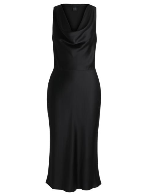SIZE AND FIT The model wears a size 4 and is 5'8" tall with a, 33" chest, 25" waist and 35" hips. DETAILS Dawida - 50528773 A modern dress with sleeveless styling by BOSS. This feminine piece is crafted in fluent satin with a draped cowl neckline. Regular fit Neckline: Wide neck Fastening top: Side zip closure No cuffs Unlined Fit back length: 105 cm (41 inches) QUALITY & CARE INSTRUCTIONS Quality: 68% Viscose, 32% Lyocell Do Not Bleach Reduced Dry Clean Do Not Tumble Dry Do Not Wash Iron Low Heat