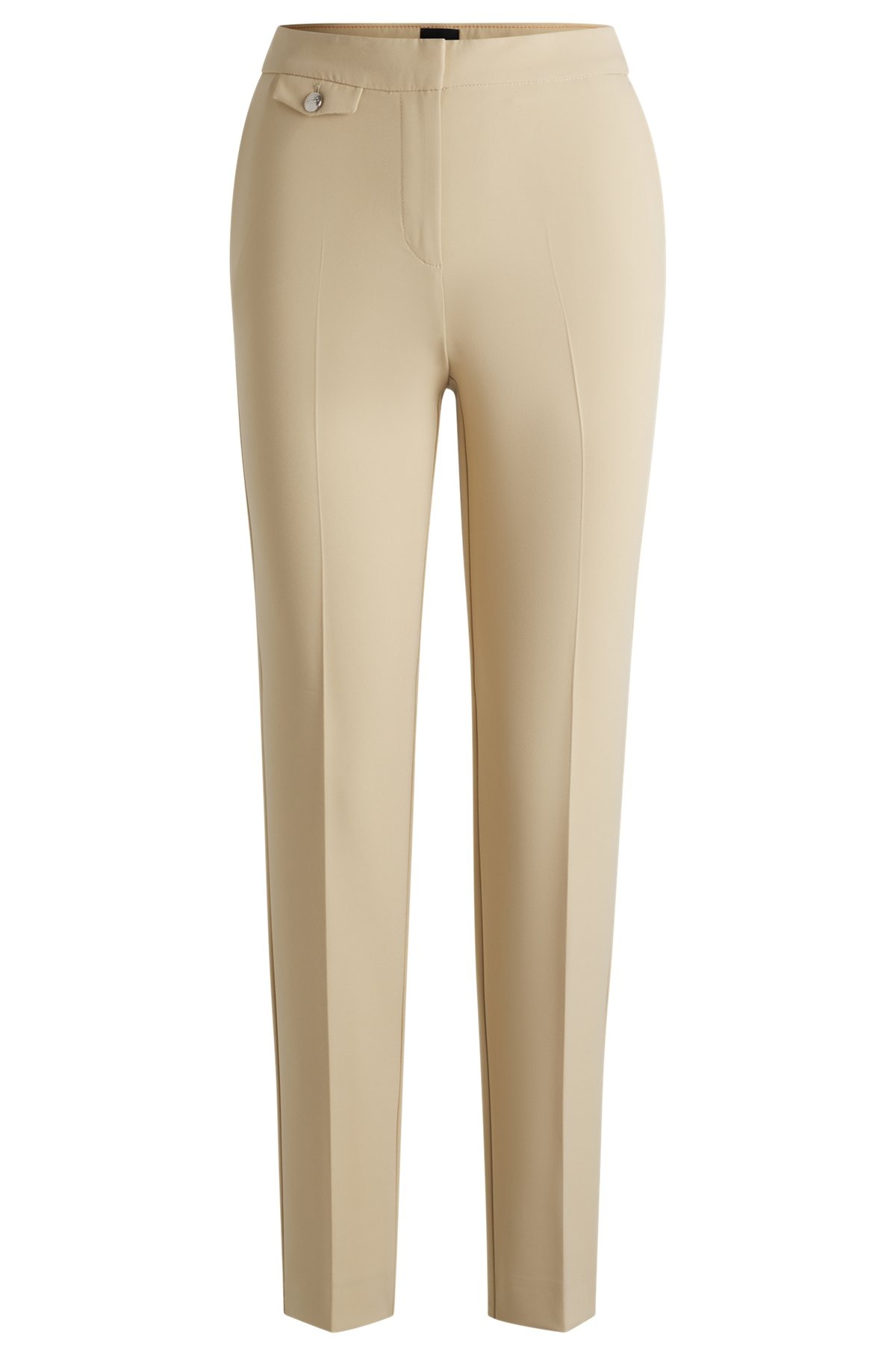 SIZE AND FIT The model wears a size 4 and is 5'11" tall with a, 31" chest, 23" waist and 34" hips. DETAILS C_Taschina1 - 50535464 Elegant chinos by BOSS Womenswear. Crafted in brushed satin with stretch for comfort, this pair is topped with a coin pocket featuring a branded button. Regular fit Button and zip closure Tapered leg Pockets bottom front: Side pockets Unlined QUALITY & CARE INSTRUCTIONS Quality: 87% Polyester, 13% Elastane, pocketing: 100% Polyester Dry Clean Only Do Not Tumble Dry Do Not Bleach Machine Wash Cold Gentle Iron Low Heat