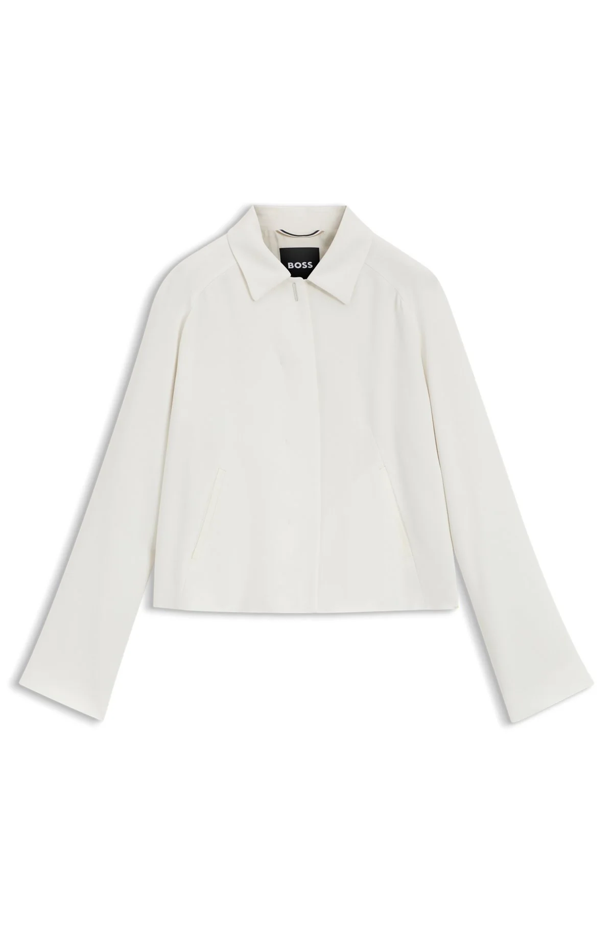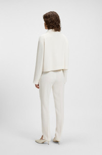 SIZE AND FIT The model wears a size 4 and is 5'9" tall with a, 31" chest, 24" waist and 35" hips. DETAILS Jandera - 50542011 Cleanly styled with a concealed closure and hardware detail, this BOSS Womenswear blazer is a sophisticated formal option. Crafted in soft crepe. Regular fit Fastening top: Press-stud closure Pockets top: Welt pockets Fit back length: 52 cm (20 inches) QUALITY & CARE INSTRUCTIONS Reduced Dry Clean Do Not Bleach Do Not Tumble Dry Do Not Wash Iron Low Heat Quality: 100% Viscose, Lining: 55% Polyester, 45% Viscose
