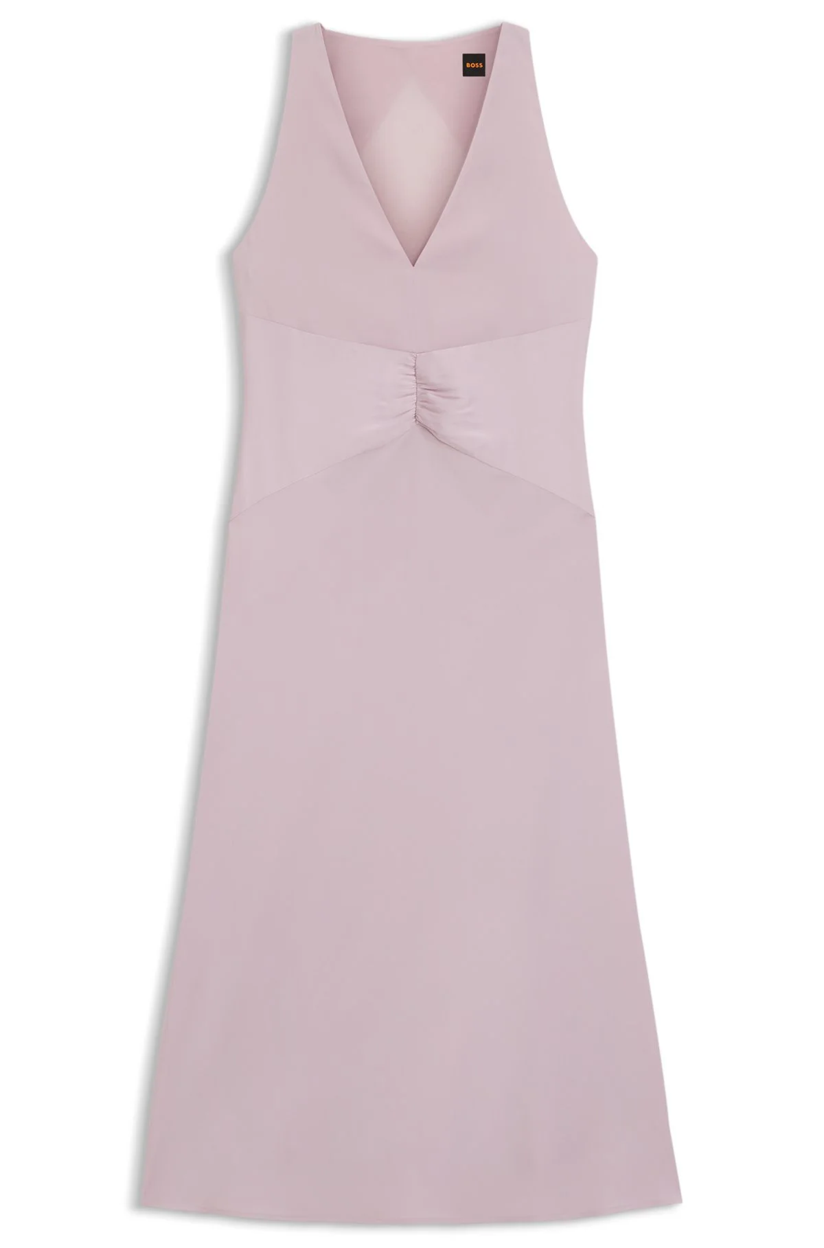 DETAILS C_DICLAN - 50544019 Crafted in drapey crinkle satin, this BOSS Womenswear dress is an elegant day-to-evening option. Gathered front and rear Georgette detailing. Fit back length: 115 cm (45 inches) QUALITY & CARE INSTRUCTIONS Quality: 97% Polyester, 3% Elastane, upper part: 100% Polyester Do Not Bleach Reduced Dry Clean Do Not Tumble Dry Iron Low Heat Machine Wash Cold Gentle
