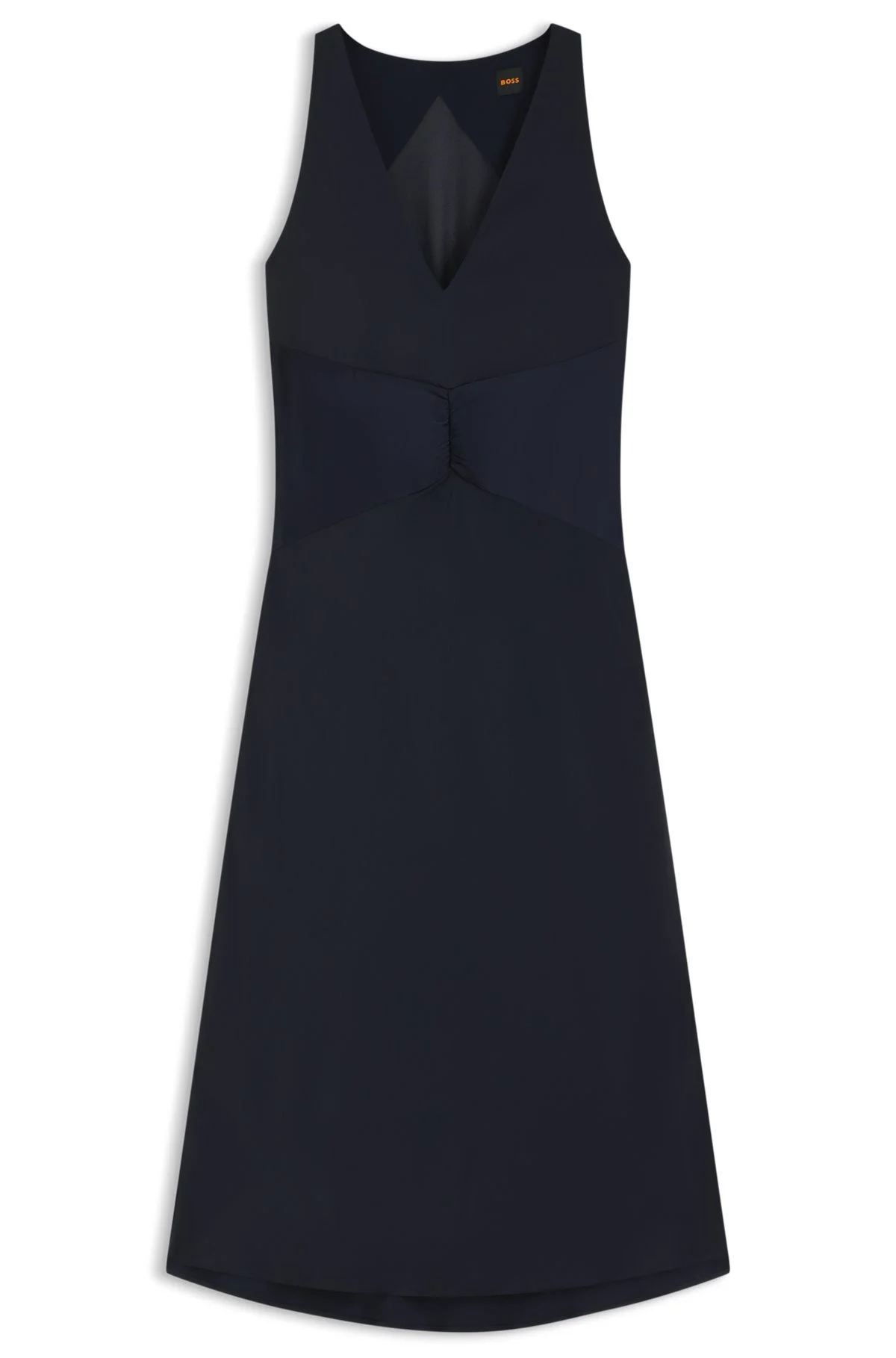 SIZE AND FIT The model wears a size 4 and is 5'8" tall with a, 29" chest, 22" waist and 35" hips. DETAILS C_DICLAN - 50544019 Crafted in drapey crinkle satin, this BOSS Womenswear dress is an elegant day-to-evening option. Gathered front and rear Georgette detailing. Fit back length: 115 cm (45 inches) QUALITY & CARE INSTRUCTIONS Reduced Dry Clean Machine Wash Cold Gentle Quality: 97% Polyester, 3% Elastane, upper part: 100% Polyester Do Not Tumble Dry Do Not Bleach Iron Low Heat