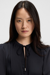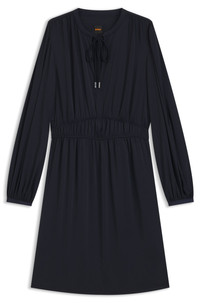 SIZE AND FIT The model wears a size 4 and is 5'10" tall with a, 31" chest, 23" waist and 35" hips. DETAILS C_DECLY - 50544038 With flattering gatherings and an elasticated waist, this BOSS Womenswear dress delivers an elegant silhouette. Tie feature at the keyhole neckline. Crafted in crinkle satin. Fit back length: 97 cm (38 inches) QUALITY & CARE INSTRUCTIONS Machine Wash Cold Do Not Bleach Quality: 97% Polyester, 3% Elastane Do Not Dry Clean Iron Low Heat Do Not Tumble Dry
