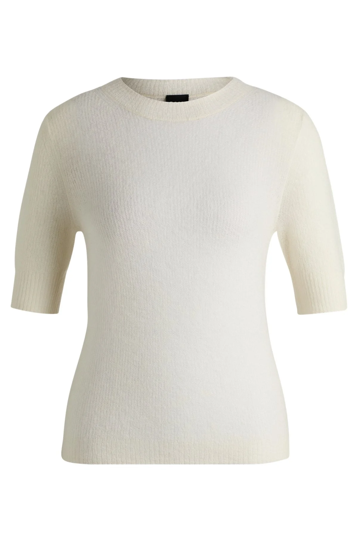 SIZE AND FIT The model wears a size S and is 5'11" tall with a, 31" chest, 23" waist and 34" hips. DETAILS Fusionana - 50530718 Fluffy yet breathable, this versatile BOSS Womenswear sweater is knitted in textured wool with fine ribbing. Crew neckline. Cropped sleeves. Neckline: Crew neck 3/4 sleeves QUALITY & CARE INSTRUCTIONS Do Not Bleach Do Not Tumble Dry Hand Wash Only Quality: 52% Mohair, 35% Polyamide, 13% Wool Dry Clean Only Iron Low Heat