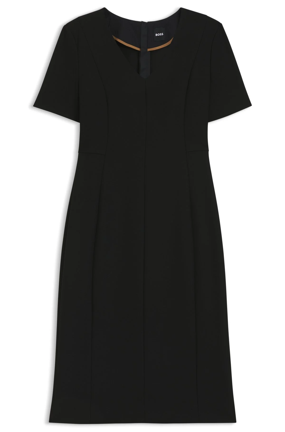 SIZE AND FIT The model wears a size 2 and is 5'9" tall with a, 31" chest, 24" waist and 35" hips. DETAILS Damaisa - 50493529 An understated V-neck dress with flattering seaming by BOSS. This unlined piece is crafted in stretch material with an exposed rear zip. This product is made with cellulose fibers, derived from natural raw wood material and sourced from managed forests. Slim fit Neckline: V-neck Fastening top: Zip closure Short sleeves Back slit Unlined Fit back length: 103 cm (41 inches) QUALITY & CARE INSTRUCTIONS Cold, gentle machine wash; reduced spin speed. Do Not Tumble Dry Quality: 67% Viscose, 29% Polyester, 4% Elastane, Facing: 100% Cotton Do Not Bleach Iron Low Heat Reduced Dry Clean