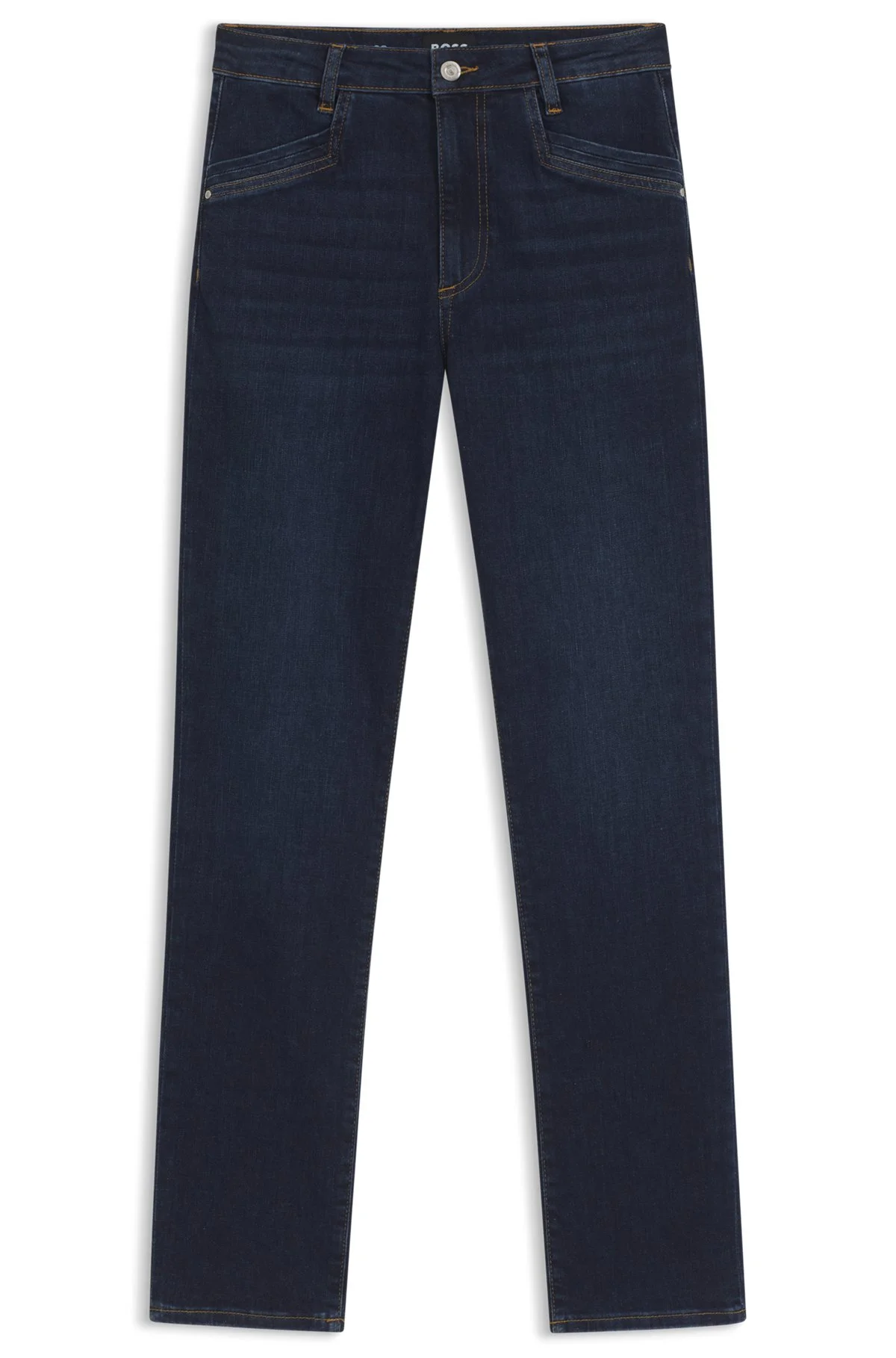 SIZE AND FIT The model wears a size EU:2732 and is 5'11" tall with a, 31" chest, 23" waist and 34" hips. DETAILS With pocket detailing inspired by tailoring, these slim-cut BOSS Womenswear jeans will freshen up your casuals. Deep-blue denim with stretch and pressed creases. Slim fit High rise Button and zip closure Pockets bottom front: Side pockets Slim leg Pockets bottom back: Patch pocket Open length STATE 2.0 - 50542555 QUALITY & CARE INSTRUCTIONS Do Not Tumble Dry Do Not Dry Clean Quality: 59% Cotton, 20% Viscose, 19% Polyester, 2% Elastane, pocketing: 70% Cotton, 30% Polyester Machine Wash Cold Gentle Do Not Bleach Iron Medium Heat