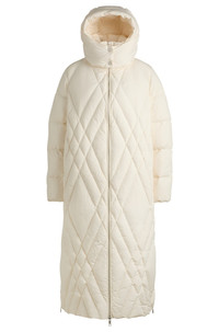 SIZE AND FIT The model wears a size 4 and is 5'9" tall with a, 33" chest, 25" waist and 35" hips. DETAILS Pigranda - 50524042 Layer up in comfort with this quilted coat by BOSS Womenswear, featuring a breathable certified duck down-and-feather filling. This water-repellent design features drawcord toggles on the hood for an adjustable fit. With a two-way zip front, zipped sides, and fleece-lined pockets. Regular fit Fastening top: Zip closure Fully lined Long length Fit back length: 120 cm (47 inches) QUALITY & CARE INSTRUCTIONS Quality: 100% Polyester (60% recycled), Lining: 100% Polyamid, Filling: 80% Duck down, 20% Duck Feather Iron Low Heat Machine Wash Cold Gentle very mild professional wet clean Do Not Bleach Tumble Dry Low Heat Do Not Dry Clean