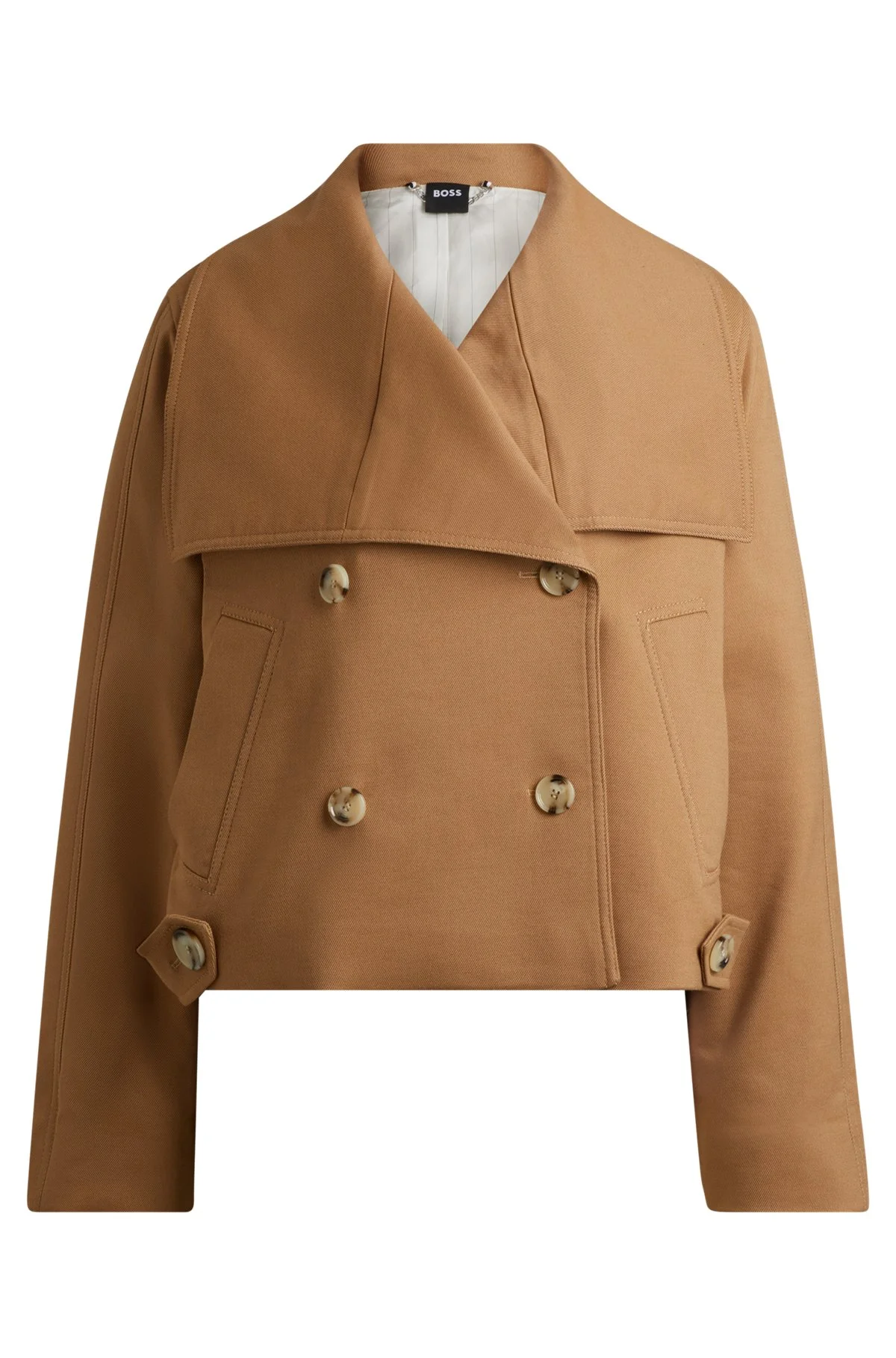 SIZE AND FIT The model wears a size 4 and is 0'0" tall with a, 0" chest, 0" waist and 0" hips. DETAILS Caspera - 50521829 A double-breasted coat by BOSS Womenswear. Blended with cotton and stretch for comfort, this piece is cut to a cropped length. Relaxed fit Oversized lapels Number of buttons: Double-breasted Pockets top: Welt pockets No cuffs Fully lined Short length QUALITY & CARE INSTRUCTIONS Do Not Tumble Dry Quality: 50% Cotton, 31% Polyester, 16% Viscose, 3% Elastane, Sleeve lining: 60% Viscose, 40% Cupro, Components: 64% Viscose, 36% Polyester Do Not Bleach Do Not Wash Iron Low Heat Reduced Dry Clean