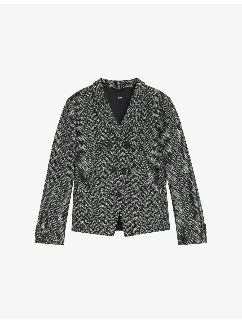 PRODUCT DETAILS - BOSS cotton-blend blazer - 48% cotton, 28% linen, 20% polyester, 4% other fibres - Button fastening - Regular fit, double-breasted, notch lapels, long sleeves, buttoned cuffs, side pockets, all-over herringbone weave - Dry clean - True to size - Model is 5ft 10in/1.78m and wears a size UK 8 - Midweight, non-stretch Ref: R04512362