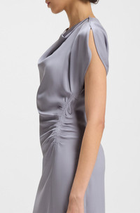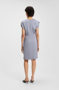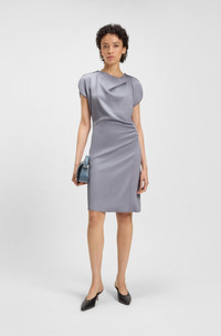 SIZE AND FIT The model wears a size 4 and is 5'10" tall with a, 31" chest, 24" waist and 35" hips. DETAILS Devania - 50542882 With a neat rear zip and slim fit, this BOSS Womenswear dress delivers a fresh silhouette. Gathered details and a cowl neckline create flattering effects. Slim fit Neckline: Tie neck Fastening top: Zip and hook closure Short sleeves Front slit Fit back length: 95 cm (37 inches) QUALITY & CARE INSTRUCTIONS Reduced Dry Clean Quality: 96% Viscose, 4% Elastane Do Not Tumble Dry Iron Low Heat Do Not Bleach Do Not Wash