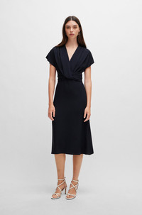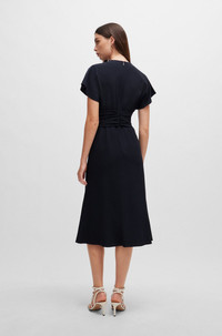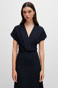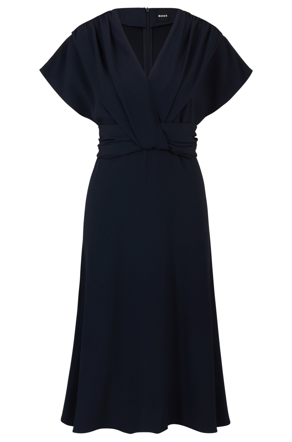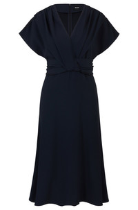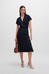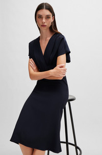 SIZE AND FIT The model wears a size 2 and is 5'10" tall with a, 31" chest, 24" waist and 35" hips. DETAILS Debasa2 - 50515198 A flattering dress by BOSS Womenswear. Designed in soft satin with a matte appearance, this elegant dress features draping details at the V neckline. A subtle rear zip offers a sleek finish. Fit back length: 115 cm (45 inches) QUALITY & CARE INSTRUCTIONS Do Not Tumble Dry Quality: 72% Acetate, 28% Viscose Do Not Bleach Do Not Wash Iron Low Heat Reduced Dry Clean