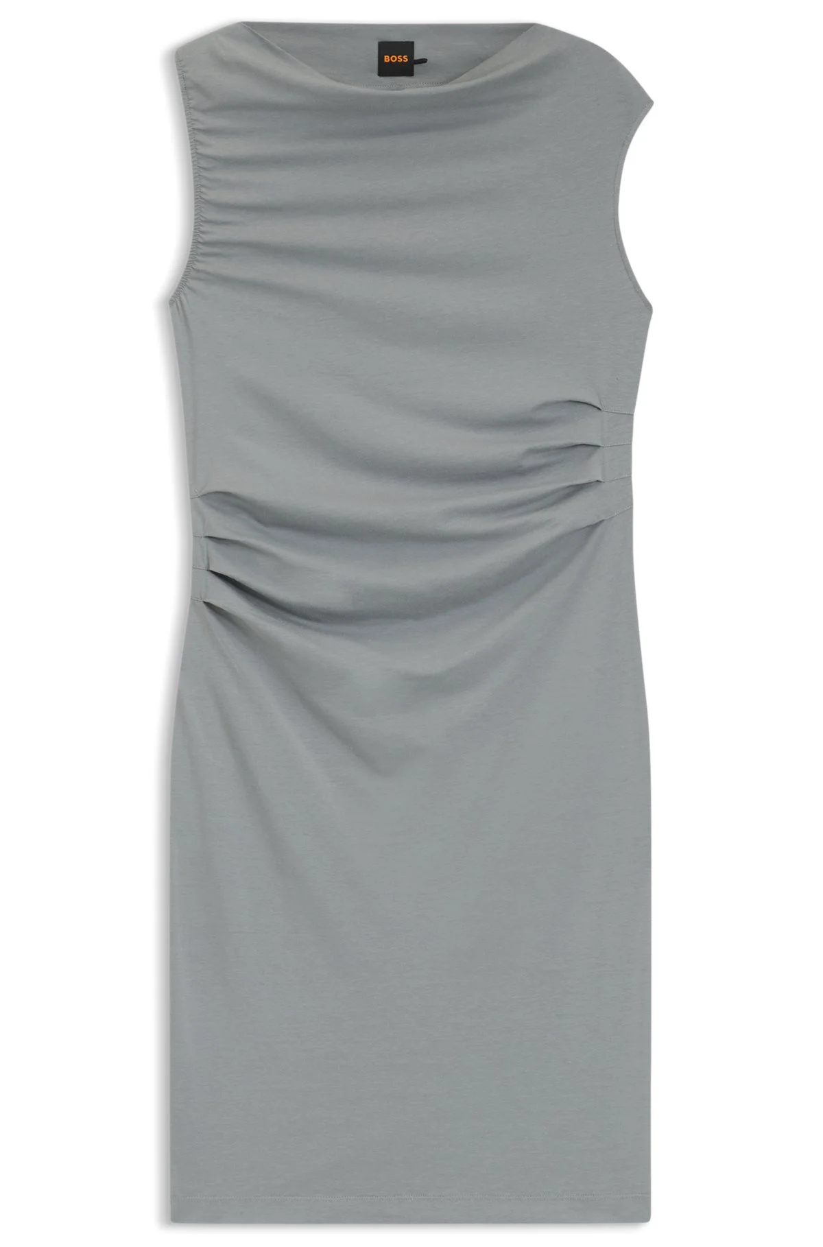 DETAILS C_Enila - 50543459 Extra soft and stretchy, this BOSS Womenswear dress can be styled up or down. Gathered accents and asymmetric neckline with draping details. Branded metal stud. Slim fit Neckline: Crew neck Cap sleeves QUALITY & CARE INSTRUCTIONS Hand Wash Only Do Not Bleach Do Not Tumble Dry Do Not Dry Clean Iron Low Heat Quality: 55% Cotton, 37% Modal, 8% Elastane