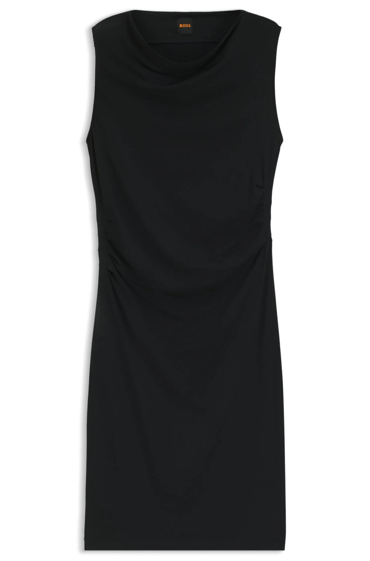 DETAILS C_Enila - 50543459 Extra soft and stretchy, this BOSS Womenswear dress can be styled up or down. Gathered accents and asymmetric neckline with draping details. Branded metal stud. Slim fit Neckline: Crew neck Cap sleeves QUALITY & CARE INSTRUCTIONS Do Not Tumble Dry Quality: 55% Cotton, 37% Modal, 8% Elastane Hand Wash Only Iron Low Heat Do Not Bleach Do Not Dry Clean