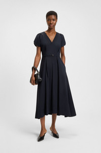 SIZE AND FIT The model wears a size 4 and is 5'11" tall with a, 31" chest, 23" waist and 34" hips. DETAILS DEMNILIA - 50546422 With a slender belt offering definition at the waist, this V-neck BOSS Womenswear dress is an effortless daywear option. Breathable poplin. Neckline: V-neck Fastening top: Zip closure Short sleeves Pockets top: Seam pocket Fit back length: 125 cm (49 inches) QUALITY & CARE INSTRUCTIONS Do Not Tumble Dry Machine Wash Cold Gentle Reduced Dry Clean Iron Low Heat Do Not Bleach Quality: 85% Cotton, 15% Polyamid