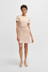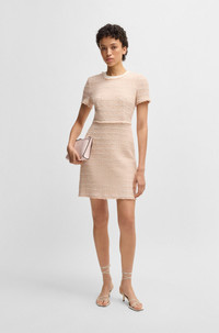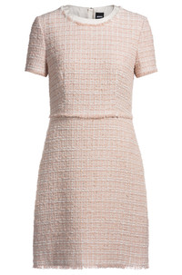 SIZE AND FIT The model wears a size 4 and is 5'10" tall with a, 31" chest, 24" waist and 35" hips. DETAILS Detona - 50537438 With subtle fringe trims, this BOSS Womenswear dress is an instant classic. Featuring a stretch-cotton trim at the neckline, this short-sleeved dress is crafted in summery tweed blended with cotton and wool. An exposed rear zip adds a modern finish. Regular fit Neckline: Crew neck Fastening top: Zip closure Short sleeves Partially lined Fit back length: 89 cm (35 inches) QUALITY & CARE INSTRUCTIONS Do Not Wash Do Not Tumble Dry Reduced Dry Clean Do Not Bleach Quality: 47% Cotton, 30% Polyacrylic, 14% Polyester, 6% Wool, 3% Other fibres, Lining: 55% Polyester, 45% Viscose, Insert: 96% Cotton, 4% Elastane Iron Low Heat
