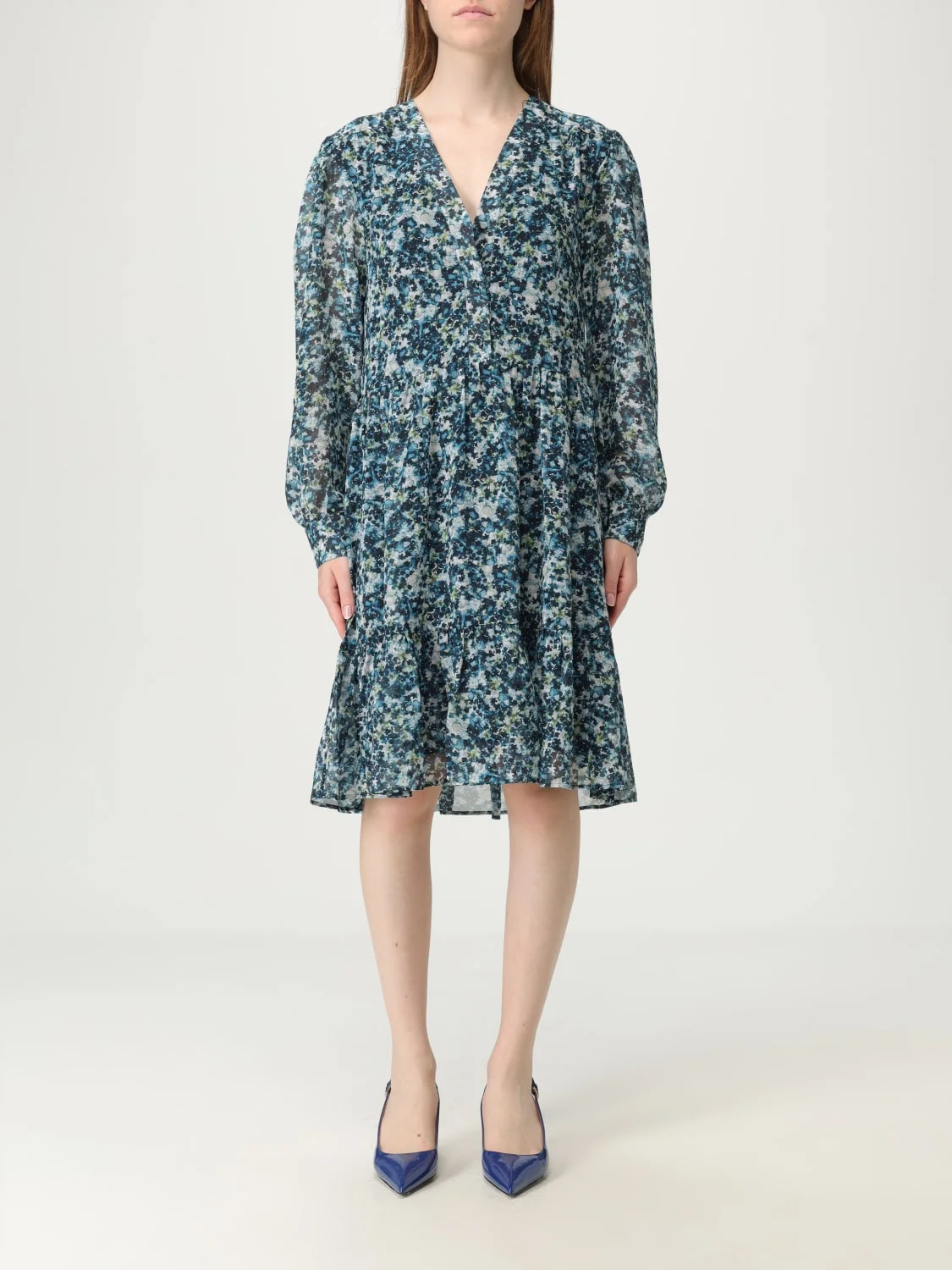 DESCRIPTION - Style: Casual - Neckline: V neckline - Shoulders: Regular - Bottom: With straight hemline - Length: Mini dresses - Occasion: Morning dresses - Sleeves: Long sleeve dresses - Materials: Crepe - Pattern: Floral DETAILS AND CARE Composition 100% Polyester (recycled) SIZE AND FIT Sizes not available Size and fit Regular fit Designer code: 50530945 974 Giglio Code: 426689 Designer: Boss Collection: Boss Woman Category: Clothing Boss