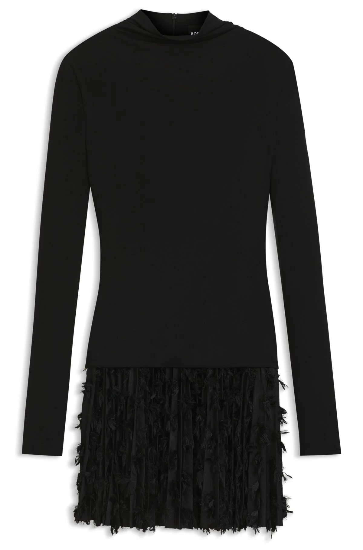 SIZE AND FIT The model wears a size S and is 5'9" tall with a, 32" chest, 23" waist and 35" hips. DETAILS Create effortless party looks with the smooth jersey and feathered plisse pleats of this BOSS Womenswear dress. Chimney-style neckline. Extra-long sleeves. Slim fit Neckline: Turtleneck Fastening top: Zip closure Long sleeves Partially lined Ecicla - 50548115 QUALITY & CARE INSTRUCTIONS Material: 100% Viscose, Lining: 86% Polyamid, 14% Elastane, Skirt: 96% Polyester, 4% Elastane Do Not Bleach Do Not Tumble Dry Do Not Iron Reduced Dry Clean Hand Wash Only