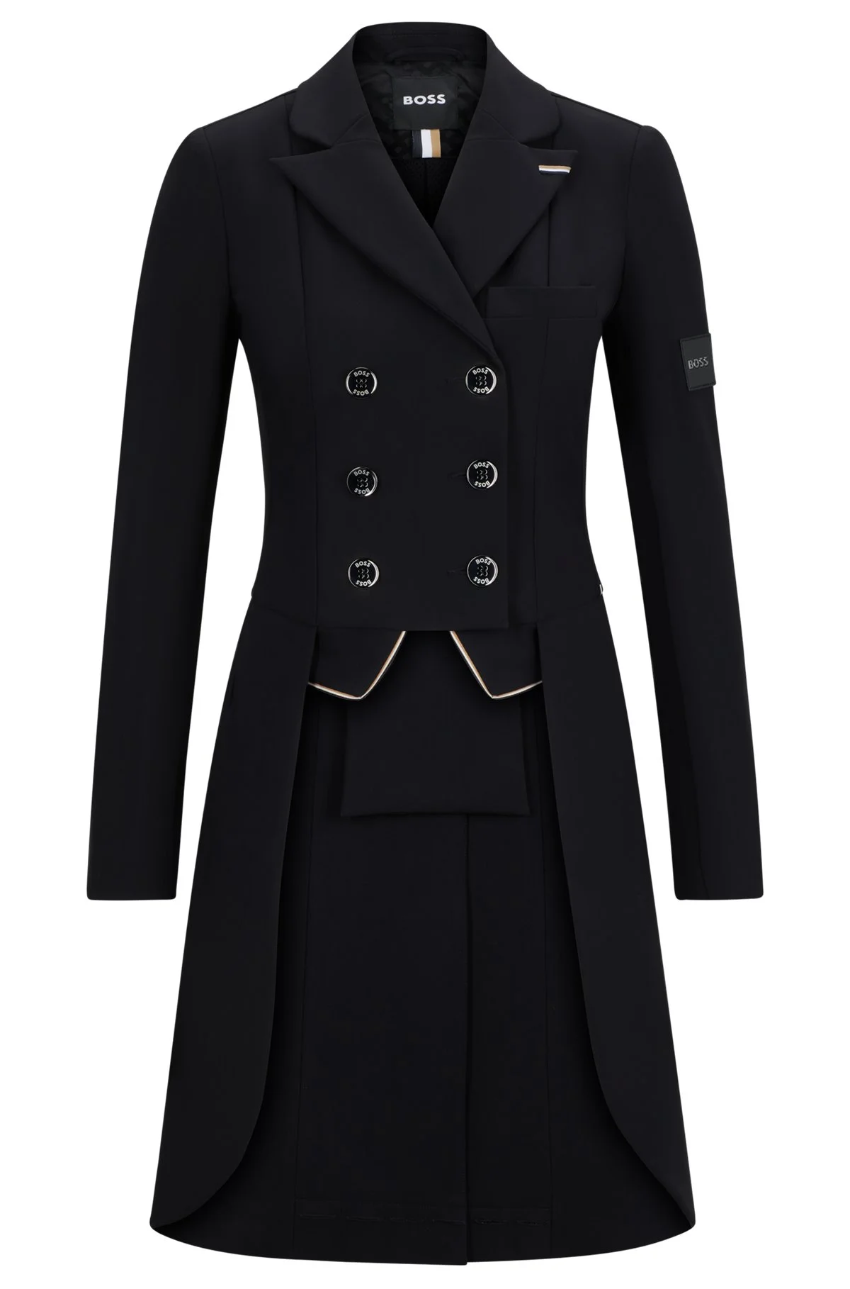 SIZE AND FIT The model wears a size S and is 5'10" tall with a, 32" chest, 23" waist and 35" hips. DETAILS A top-of-the-line show tailcoat by BOSS Womenswear. Crafted in lint-resistant stretch material with quick-drying properties and a UPF of 50+, this high-performance jacket features adjustable weights on the tails for the perfect fit and total freedom of movement. Branded gunmetal buttons underline the elegance of this piece. MORGAN TAILCOAT - B4W0102 QUALITY & CARE INSTRUCTIONS Material: 73% Polyamid, 27% Elastane Do Not Tumble Dry Do Not Dry Clean Do Not Iron Do Not Bleach Machine Wash Cold Gentle
