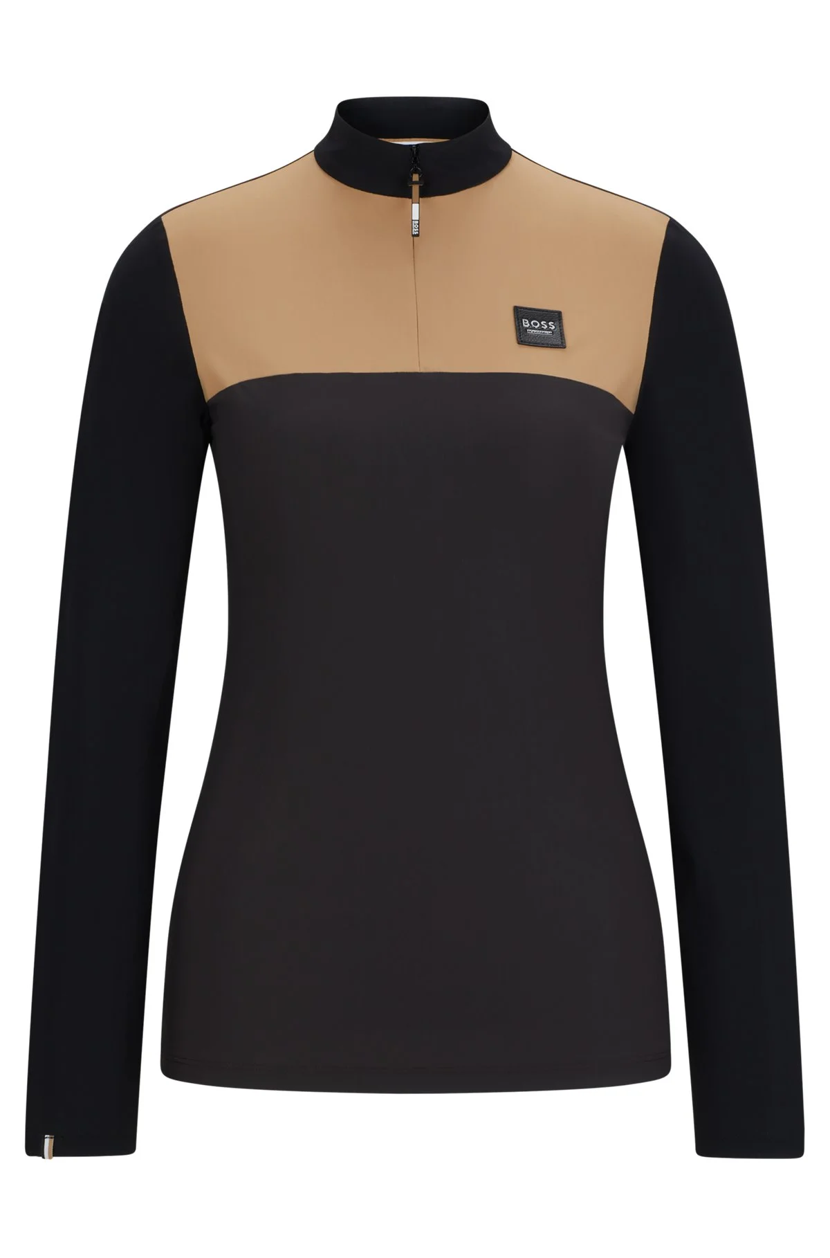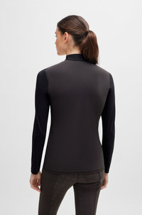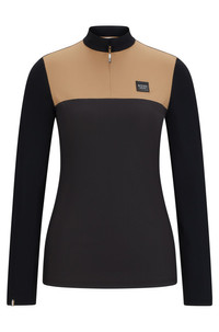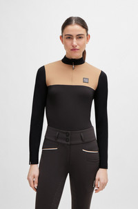 SIZE AND FIT The model wears a size S and is 5'10" tall with a, 32" chest, 23" waist and 35" hips. DETAILS RENEE TRAINING SHIRT - B4W0404 A high-performance training top in super-stretch material by BOSS Womenswear. Offering UPF 50+, this zip-neck top is engineered in ultra-lightweight and breathable fabric that dries quickly for a comfortable feel as you ride. The fabric is also lint resistant and easy to clean to ensure a precise look always. QUALITY & CARE INSTRUCTIONS Do Not Dry Clean Do Not Tumble Dry Machine Wash Cold Gentle Quality: 73% Polyamid, 27% Elastane Do Not Bleach Do Not Iron