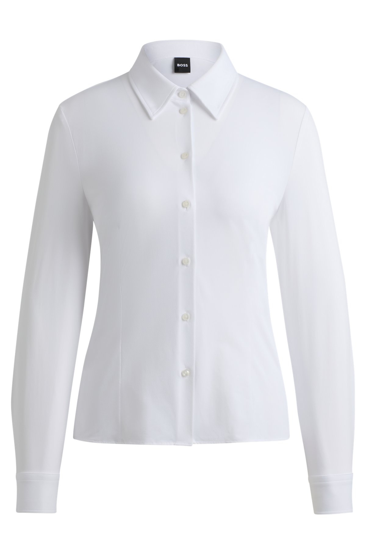 SIZE AND FIT The model wears a size 2 and is 5'9" tall with a, 33" chest, 25" waist and 36" hips. DETAILS Boanna - 50518181 An advanced blouse by BOSS Womenswear, tailored to an extra-slim fit in Italian-made fabric with a micro-dobby weave and performance-stretch qualities. Extra-slim fit Point collar Long sleeves QUALITY & CARE INSTRUCTIONS Quality: 13% Elastane Machine Wash Cold Gentle Do Not Tumble Dry Iron Low Heat Do Not Bleach Dry Clean Only