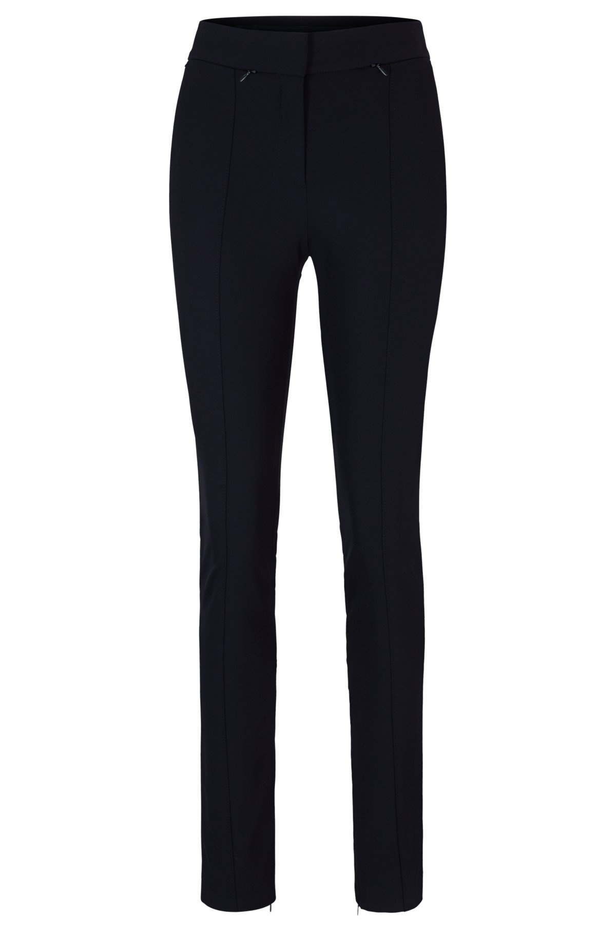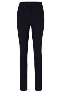 SIZE AND FIT The model wears a size 6 and is 5'10" tall with a, 31" chest, 22" waist and 33" hips. DETAILS Tukeva - 50505972 Zip-hem high-rise trousers cut to a skinny fit by BOSS Womenswear, crafted in super-stretch machine-washable fabric with quick-dry performance. Extra-slim fit High rise Hook and zip closure Skinny leg Pockets bottom front: Zip pockets Fit foot width: 30,0 cm (11.8 inches) QUALITY & CARE INSTRUCTIONS Do Not Bleach Machine Wash Cold Gentle Iron Low Heat Reduced Dry Clean Quality: 88% Polyamid, 12% Elastane, pocketing: 100% Cotton Do Not Tumble Dry