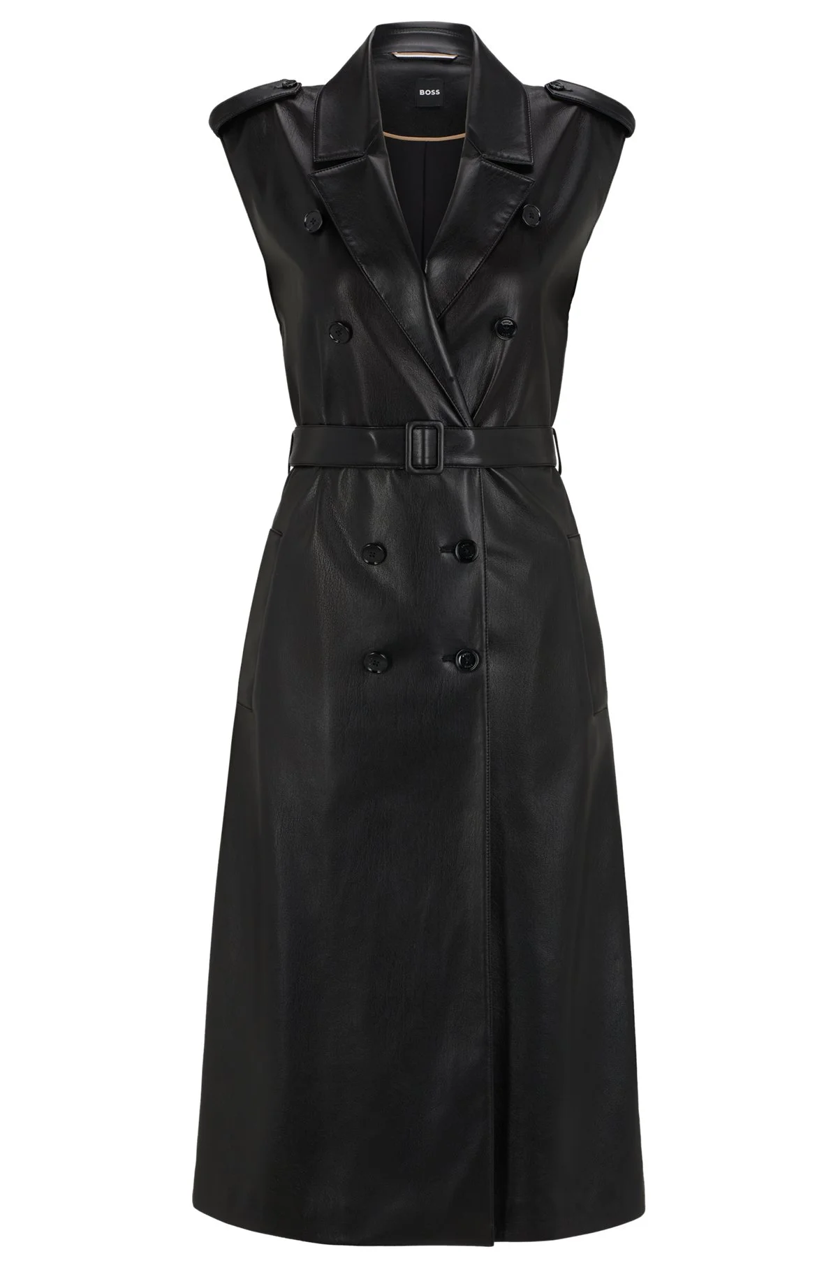 SIZE AND FIT The model wears a size 4 and is 5'10" tall with a, 31" chest, 24" waist and 35" hips. DETAILS Dujeta - 50518473 A contemporary dress by BOSS Womenswear. Featuring a buckled belt for a defined silhouette, this sleeveless dress is crafted in synthetic coated fabric for a statement effect. A double-breasted closure adds a modern finish to this regular-fit piece. Synthetic coated fabric, sometimes referred to as faux leather, is a fabric designed to resemble real leather, and/or display a matte, glossy, smooth, or textured, coated appearance. Regular fit Fastening top: Belted closure Sleeveless No cuffs Pockets top: Single welt pocket Back vent Fit back length: 118 cm (46 inches) QUALITY & CARE INSTRUCTIONS Iron Low Heat Quality: 100% Polyester, Lining: 100% Polyester Reduced Dry Clean Do Not Bleach Cold, gentle machine wash; reduced spin speed. Do Not Tumble Dry