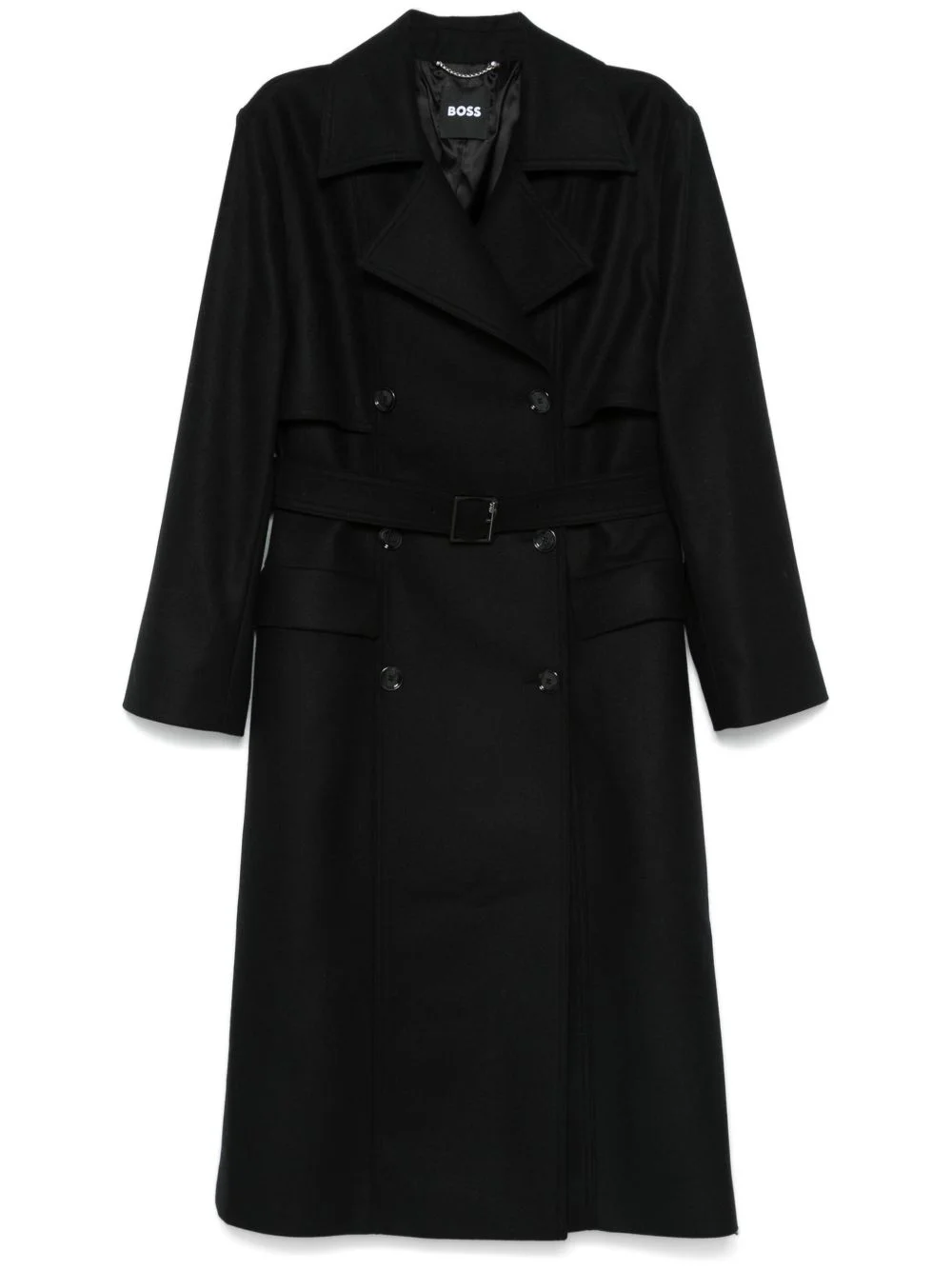 felted trench coat Highlights - Black - Recycled wool blend - Gabardine weave - Felted finish - Double-breasted button fastening - Wide notch lapels - Long sleeves - Split cuffs - Detachable waist belt - Two front flap pockets - Storm flap - Central rear vent - Full lining - Straight hem - Mid-length Imported Composition Outer: Recycled Wool 70%, Polyester 20%, Polyamide 10% Lining: Viscose 100% SIZE & FIT Model measurements Height 5 ft 10 in(1.77 m) Bust/Chest 33.07 in(84 cm) Hips 37 in(94 cm) Waist 24.8 in(63 cm) FittingInformation Designed to be unstructured, offering a loose fit throughout The belt offers adjustability for fitted preferences Made from a midweight non-stretch fabric Washing instructions Dry Clean Only