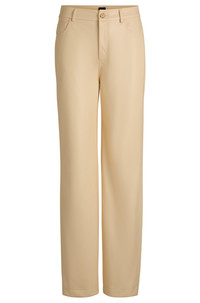 SIZE AND FIT The model wears a size 4 and is 5'9" tall with a, 31" chest, 24" waist and 35" hips. DETAILS Crossroad1 - 50534543 Denim-inspired trousers with five-pocket styling, by BOSS Womenswear. This contemporary pair is crafted in synthetic coated fabric with a weighty feel. Synthetic coated fabric, sometimes referred to as faux leather, is a fabric designed to resemble real leather, and/or display a matte, glossy, smooth, or textured, coated appearance. Button and zip closure Pockets bottom front: Side pockets Pockets bottom back: Patch pocket QUALITY & CARE INSTRUCTIONS Cold, gentle machine wash; reduced spin speed. Do Not Tumble Dry Quality: 100% Polyester, pocketing: 100% Polyester Do Not Bleach Iron Low Heat Reduced Dry Clean