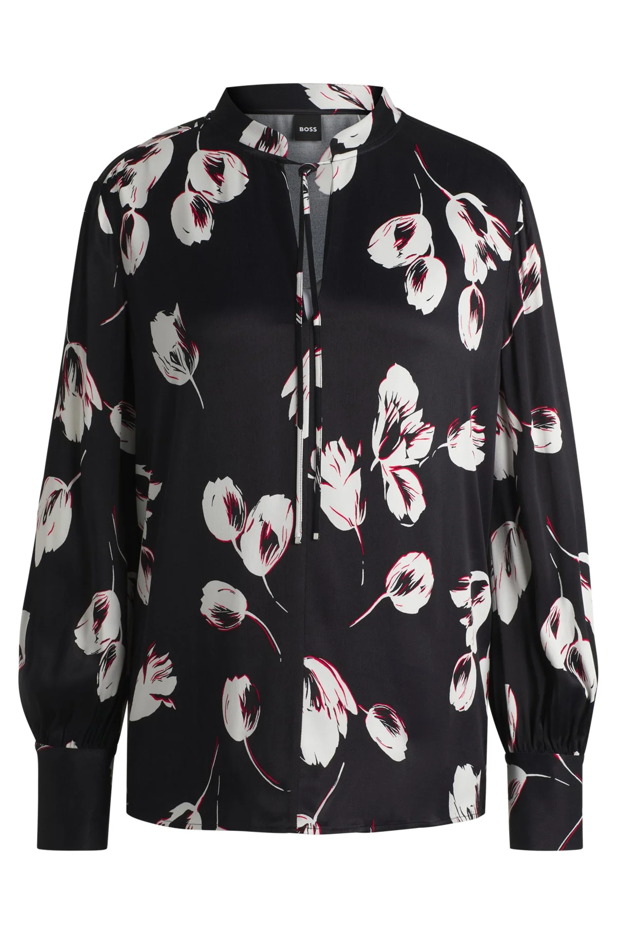SIZE AND FIT The model wears a size 4 and is 5'9" tall with a, 31" chest, 24" waist and 35" hips. DETAILS Barabi - 50534553 A relaxed-fit blouse by BOSS Womenswear, crafted in fluent satin. Featuring a tulip print, this design features a stand collar with a tie detail. Relaxed fit Stand collar Fastening top: Drawstring closure Long sleeves Button cuffs Fit back length: 64 cm (25 inches) QUALITY & CARE INSTRUCTIONS Reduced Dry Clean Do Not Bleach Do Not Tumble Dry Quality: 100% Viscose Do Not Wash Iron Low Heat