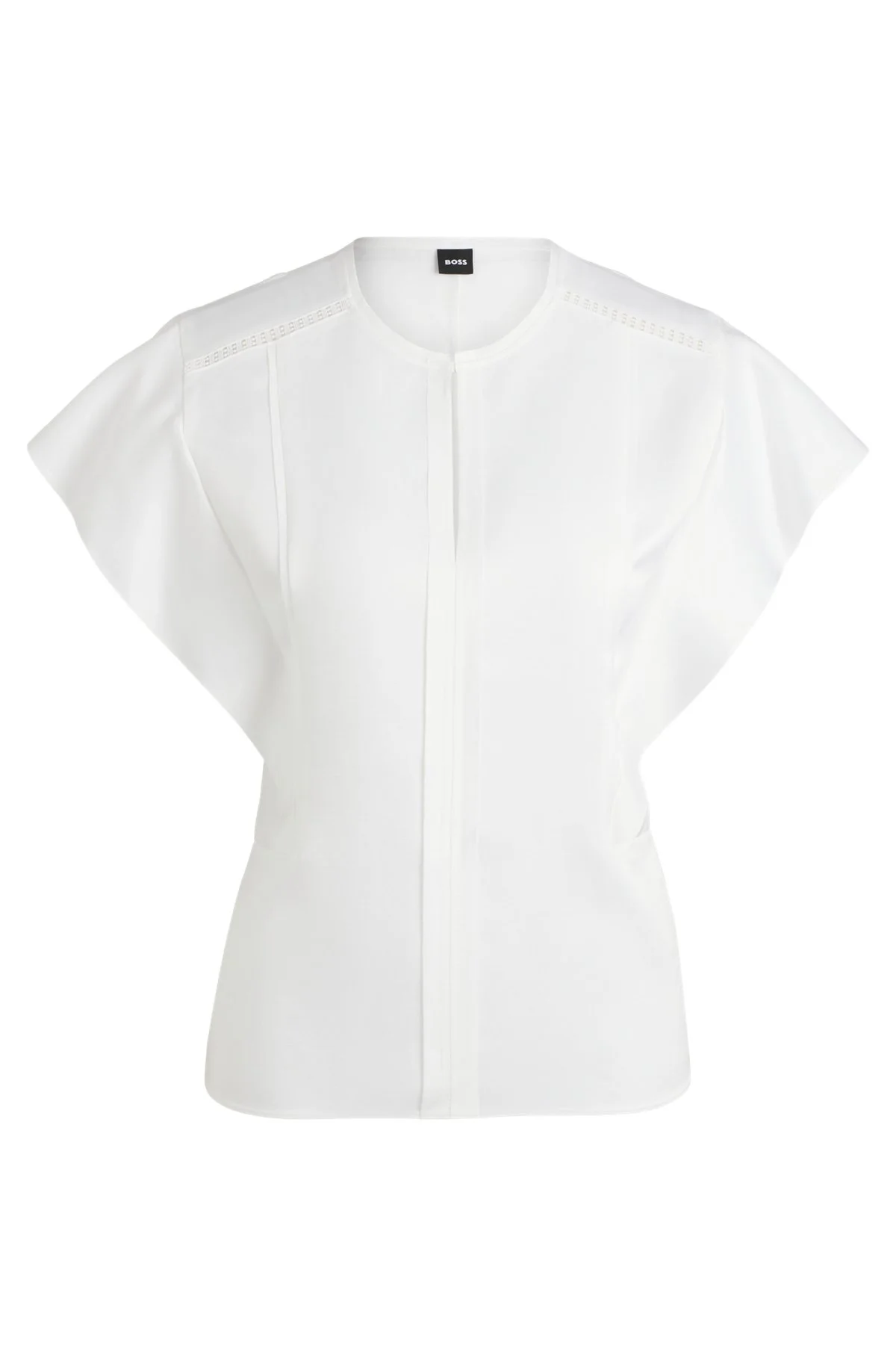 DETAILS Beliniara - 50540635 With elegant sleeve details and crochet-style trims, this BOSS Womenswear blouse is blended with cooling linen. Contemporary keyhole neckline. Regular fit Collarless Fastening top: Hook and eye closure Fit back length: 60 cm (24 inches) QUALITY & CARE INSTRUCTIONS Do Not Bleach Do Not Tumble Dry Iron Low Heat Do Not Wash Reduced Dry Clean Quality: 59% Viscose, 41% Linen