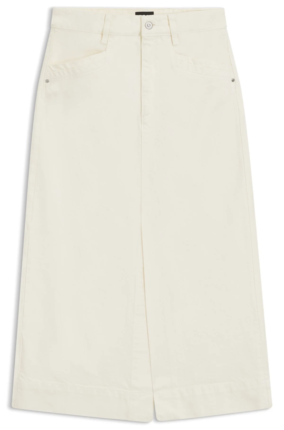 SIZE AND FIT The model wears a size 2 and is 5'10" tall with a, 33" chest, 23" waist and 34" hips. DETAILS Clean and crisp, this midi-length BOSS Womenswear skirt is a casual must. Off-white rigid denim. Slit details and tailoring-inspired pockets. Regular fit Regular rise Button and zip closure Pockets bottom front: Side pockets Front slit Standard length SEMAIRE - 50542546 QUALITY & CARE INSTRUCTIONS Do Not Tumble Dry Do Not Dry Clean Machine Wash Cold Gentle Do Not Bleach Iron Medium Heat Quality: 54% Cotton, 46% Lyocell, pocketing: 65% Polyester, 35% Cotton