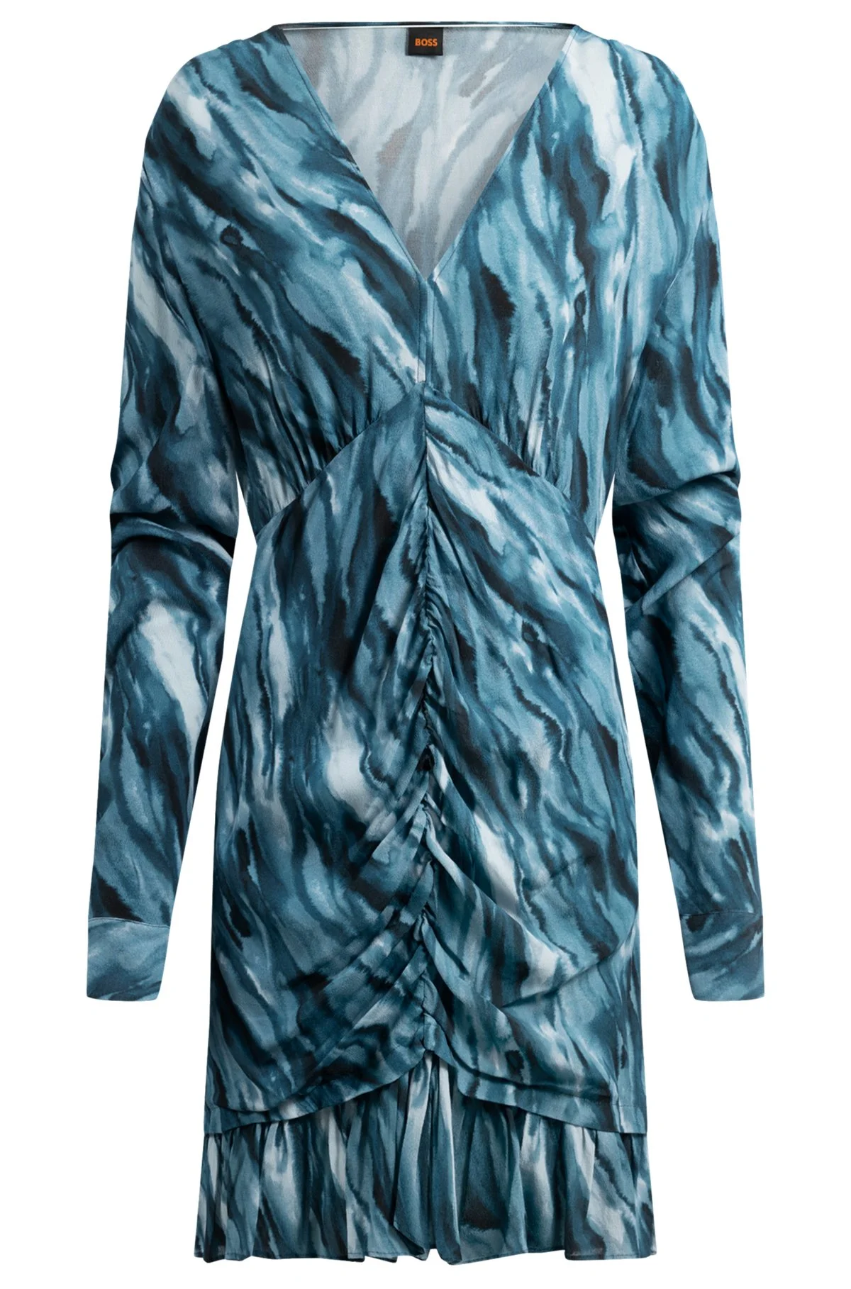SIZE AND FIT The model wears a size 2 and is 5'9" tall with a, 31" chest, 24" waist and 35" hips. DETAILS C_Dittan - 50530949 A long-sleeved dress with a V neckline, by BOSS Womenswear. This elegant piece features gathered details and a seasonal marble-effect print. Regular fit Neckline: V-neck Fastening top: Side zip closure Long sleeves Button cuffs Unlined Fit back length: 90 cm (35 inches) QUALITY & CARE INSTRUCTIONS Reduced Dry Clean Do Not Bleach Do Not Tumble Dry Hand Wash Only Quality: 100% Viscose, Inner dress: 100% Polyester Iron Low Heat