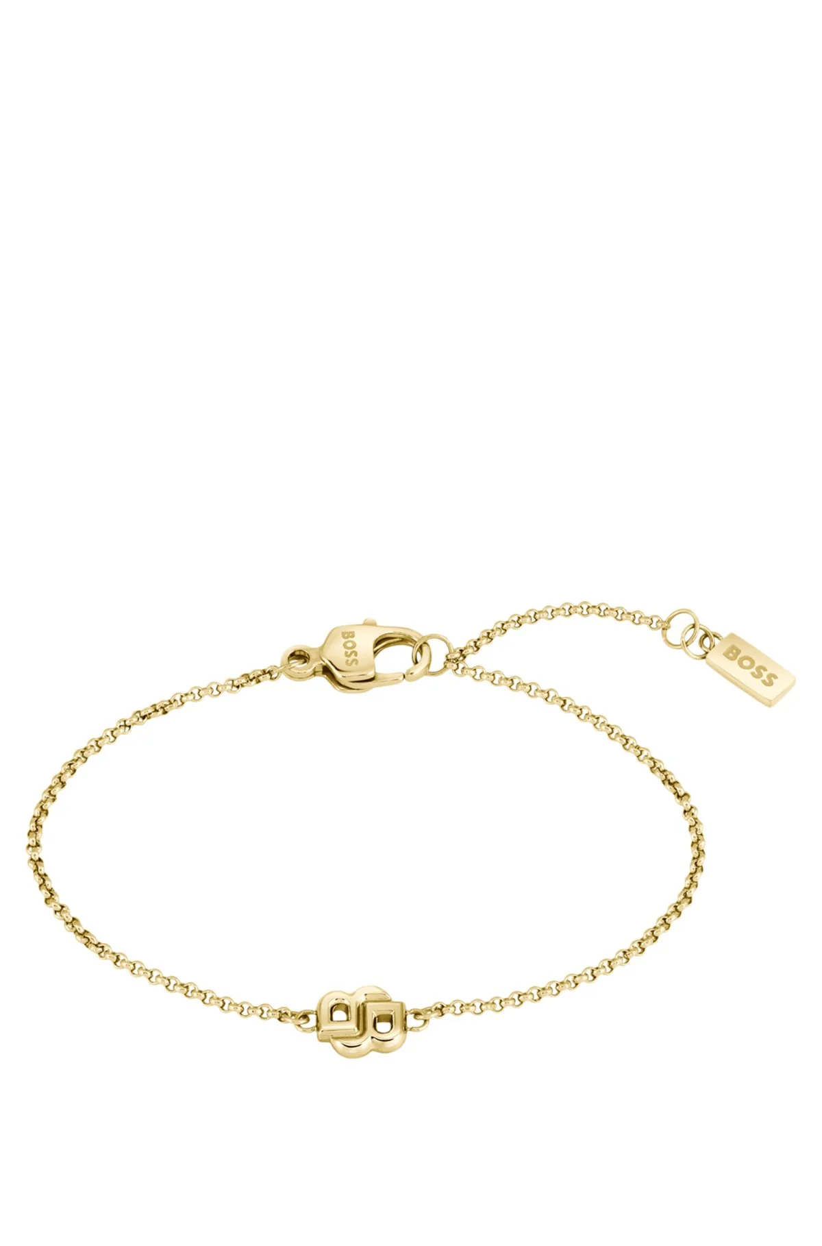 DETAILS DOUBLE B PETIT - HB1580698 Choose this slender, delicate BOSS Jewelry bracelet to add a distinctive touch to everyday looks. Gold-tone finish with Double B monogram detail. Wrist circumference: 16cm with 2.5cm extender. Width: 0.8cm QUALITY & CARE INSTRUCTIONS Quality: 100% Stainless steel