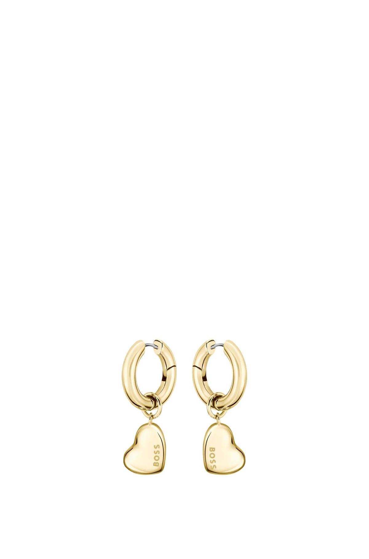 DETAILS HONEY LOVE - HB1580641 These earrings by BOSS Jewelry exude effortless chic with elegantly curved heart charms suspended from huggie hoops. Polished gold-tone steel. Subtle branding. Hinge closure. Hoop length: 2cm Charm length: 1.5cm QUALITY & CARE INSTRUCTIONS Quality: 100% Stainless steel