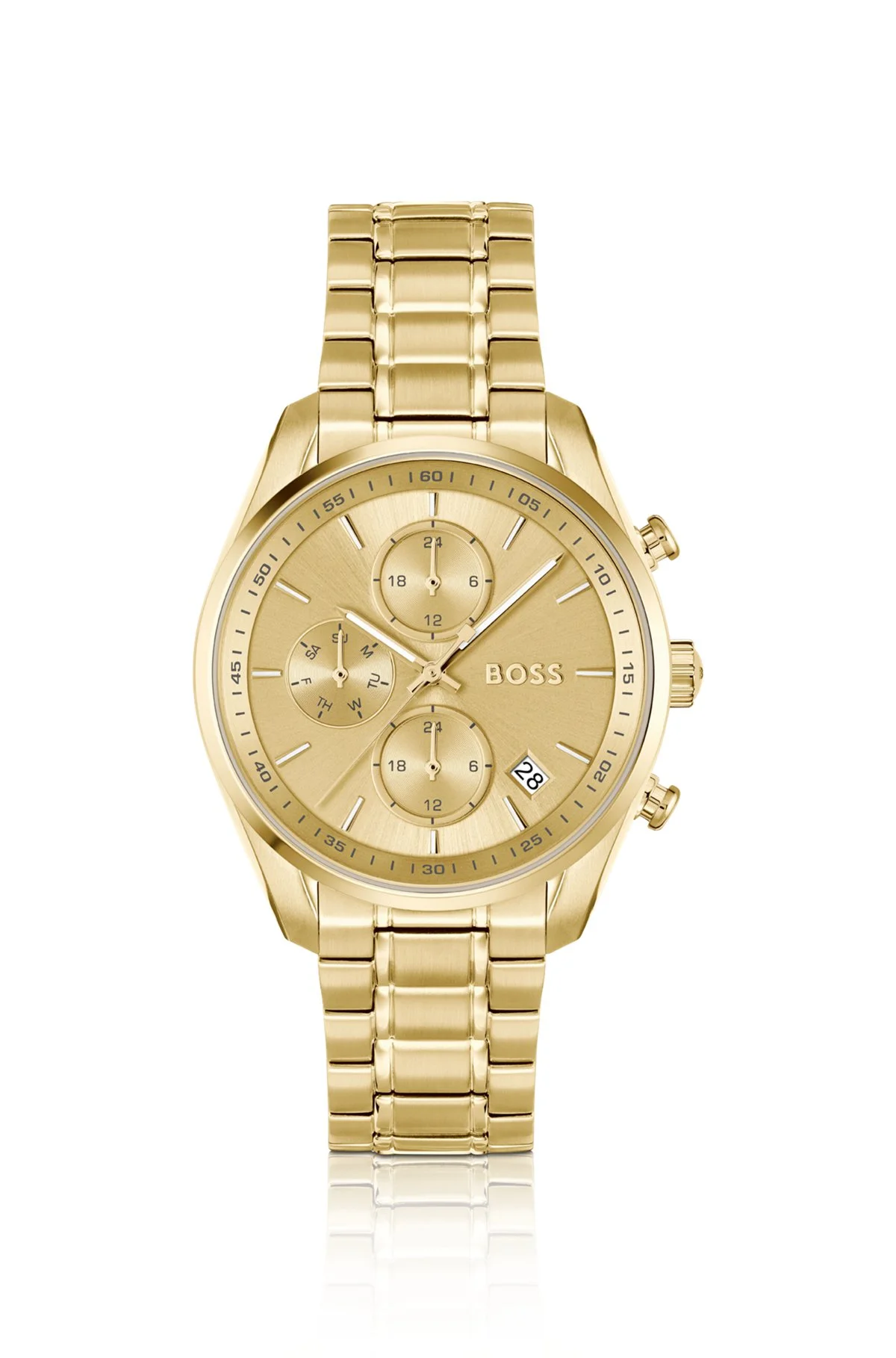 DETAILS GRAND TOUR LADIES - HB1502768 With a sporty and elegant boyfriend look, this BOSS Womenswear watch offers luxe appeal in a golden palette. Brushed dial with reflector ring. Tapered bracelet. QUALITY & CARE INSTRUCTIONS Quality: 100% Stainless steel