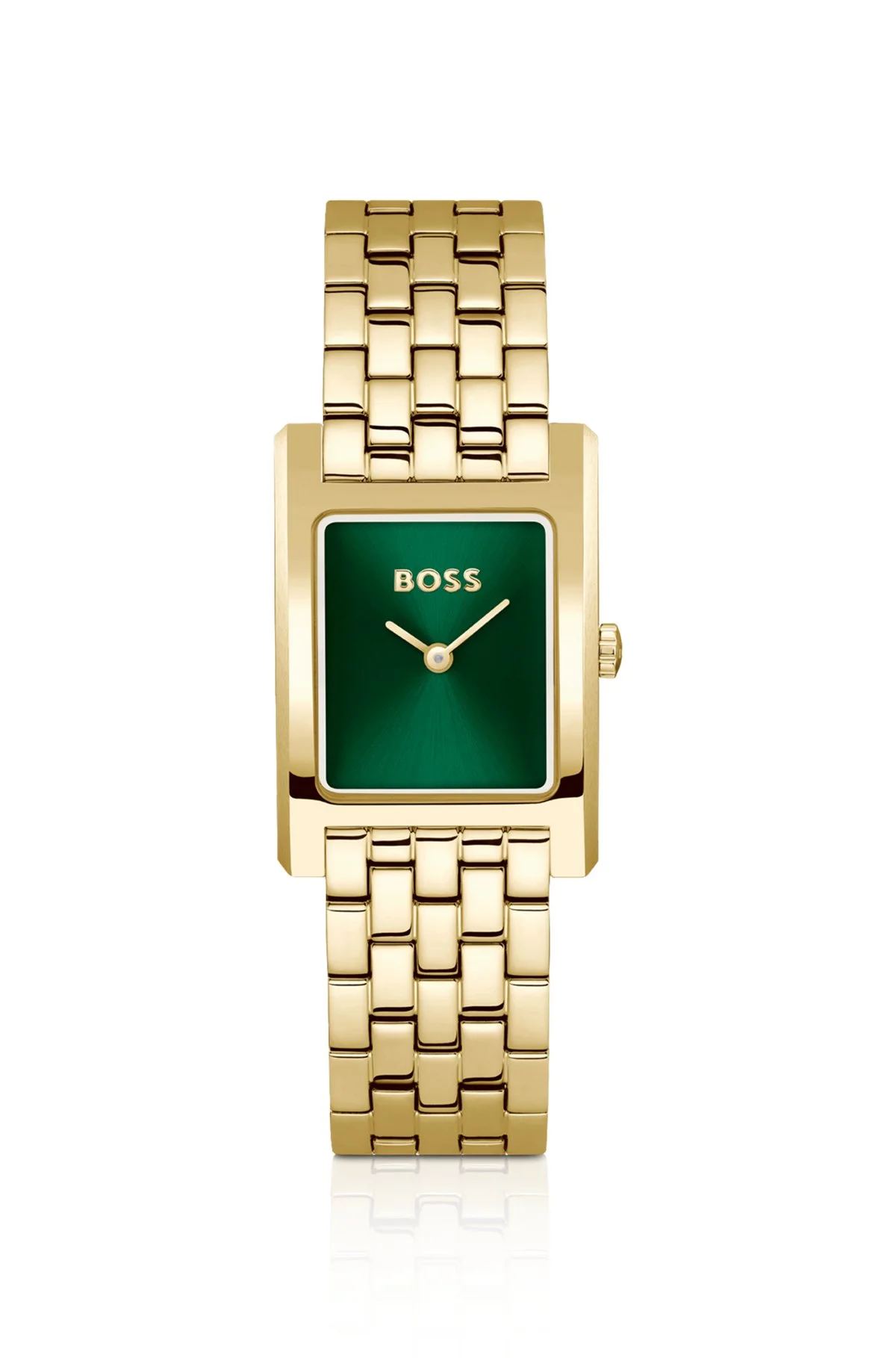 DETAILS LUCY QTM - 58201176 Hand polished in gold-tone steel, the case of this BOSS Womenswear watch has a modern square profile. Green dial with sunray brushing. Watch mechanism: Two-hand Dial color: green Strap material: Stainless steel Closure: Push-button deployment Water Resistance (in ATM): 3 ATM QUALITY & CARE INSTRUCTIONS Quality: 100% Stainless steel