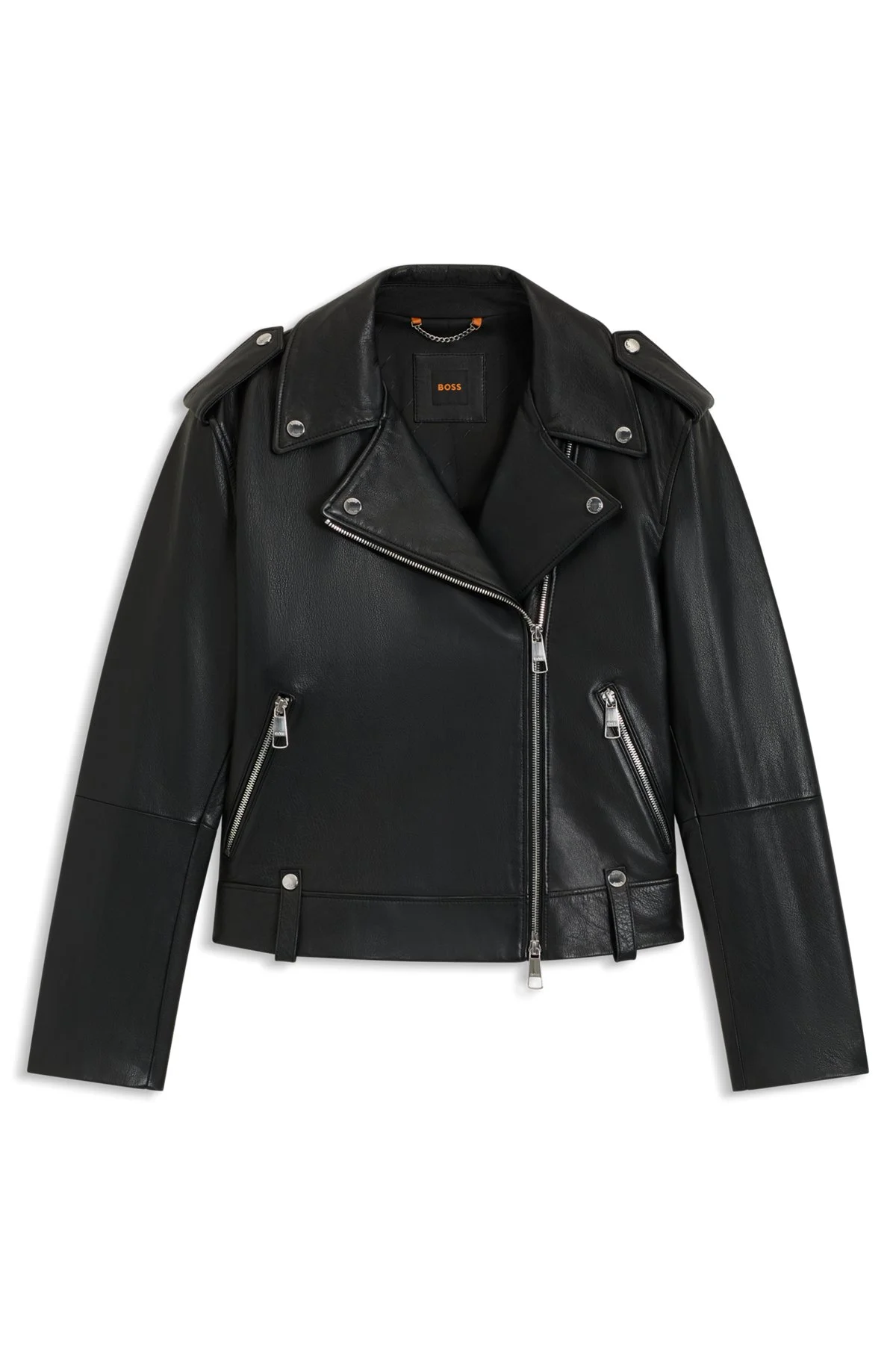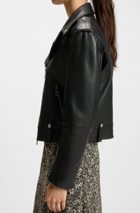 SIZE AND FIT The model wears a size 4 and is 5'10" tall with a, 31" chest, 24" waist and 35" hips. DETAILS C_Sandy - 50541769 With a regular fit for an authentic look, this BOSS Womenswear jacket is crafted in soft leather with a grained texture. Polished hardware trims. Fit back length: 53 cm (21 inches) QUALITY & CARE INSTRUCTIONS Do Not Tumble Dry Quality: 100% Buffalo skin, Lining: 55% Polyester, 45% Viscose Reduced Dry Clean Do Not Wash Do Not Bleach Do Not Iron