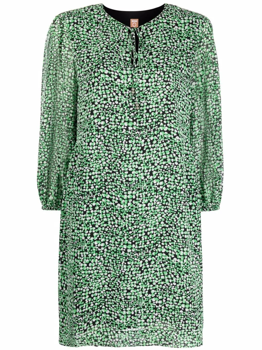 graphic-print long-sleeve dress BOSS pairs modern design with opulent construction. Showcased on this long-sleeve dress, which is constructed from sophisticated materials, the garment features an intricate all-over graphic print. Highlights - Green - All-over graphic print - Round neck - Front tie fastening - Long sleeves Imported Composition Outer: Recycled Polyester 60%, Polyester 40% Lining: Viscose 100% SIZE & FIT Model measurements Height 5 ft 10 in(1.78 m) Bust/Chest 32.28 in(82 cm) Hips 35.03 in(89 cm) Waist 23.22 in(59 cm) FittingInformation This piece fits true to size. We recommend you get your regular size Cut for a loose fit Made with a mid-weight non-stretch fabric