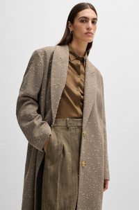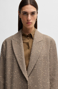 SIZE AND FIT The model wears a size 4 and is 5'9" tall with a, 31" chest, 24" waist and 35" hips. DETAILS Carund1 - 50535103 A formal coat with a herringbone tweed and a concealed closure by BOSS Womenswear. Blended with cotton and wool, this piece is fully lined. Regular fit Peaked lapels Number of buttons: 2 Pockets top: Seam pocket Back vent Fully lined Standard length Fit back length: 124 cm (49 inches) QUALITY & CARE INSTRUCTIONS Iron Low Heat Do Not Wash Do Not Tumble Dry Reduced Dry Clean Do Not Bleach Quality: 22% Wool, 45% Cotton, 22% Polyester, 7% Other fibres, 4% Polyamid, Lining: 100% Viscose, undercollar: 67% Wool, 33% Viscose