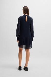SIZE AND FIT The model wears a size 4 and is 5'9" tall with a, 31" chest, 24" waist and 35" hips. DETAILS Dolumi - 50531542 An elegant dress with a plisse-pleated body by BOSS Womenswear. This distinctive piece features sheer sleeves, a high neckline and a rear keyhole closure. Regular fit Neckline: Stand collar Fastening top: Keyhole closure Long sleeves Button cuffs Partially lined Fit back length: 90 cm (35 inches) QUALITY & CARE INSTRUCTIONS Quality: 100% Polyester, Lining: 100% Viscose Do Not Tumble Dry Machine Wash Cold Do Not Bleach Do Not Iron Do Not Dry Clean