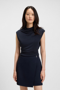 SIZE AND FIT The model wears a size S and is 5'10" tall with a, 31" chest, 23" waist and 35" hips. DETAILS Elamma - 50541896 In soft, breathable fabric, this BOSS Womenswear top has a matte finish for versatile styling. High neckline with draped effects. Slim fit Neckline: Turtleneck Cap sleeves QUALITY & CARE INSTRUCTIONS Do Not Tumble Dry Hand Wash Only Do Not Bleach Reduced Dry Clean Quality: 100% Viscose Iron Low Heat