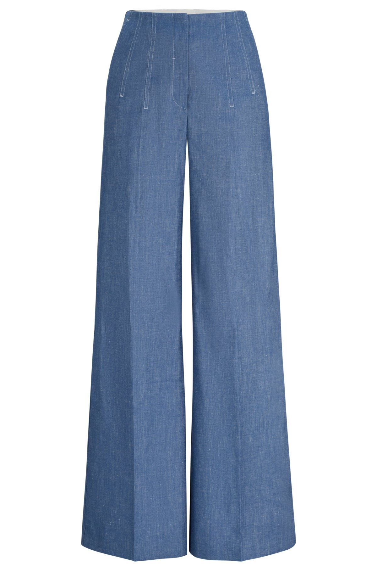 SIZE AND FIT The model wears a size 4 and is 5'10" tall with a, 34" chest, 24" waist and 35" hips. DETAILS Tasena1 - 50514913 Relaxed-fit trousers with a wide leg and high rise by BOSS Womenswear, crafted in linen blended with cotton and stretch. Relaxed fit High rise Wide leg Fit foot width: 64,0 cm (25.2 inches) QUALITY & CARE INSTRUCTIONS Quality: 59% Linen, 40% Cotton, 1% Elastane, pocketing: 100% Cotton Cold, gentle machine wash; reduced spin speed. Do Not Tumble Dry Iron Low Heat Do Not Bleach Reduced Dry Clean